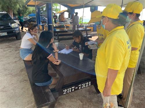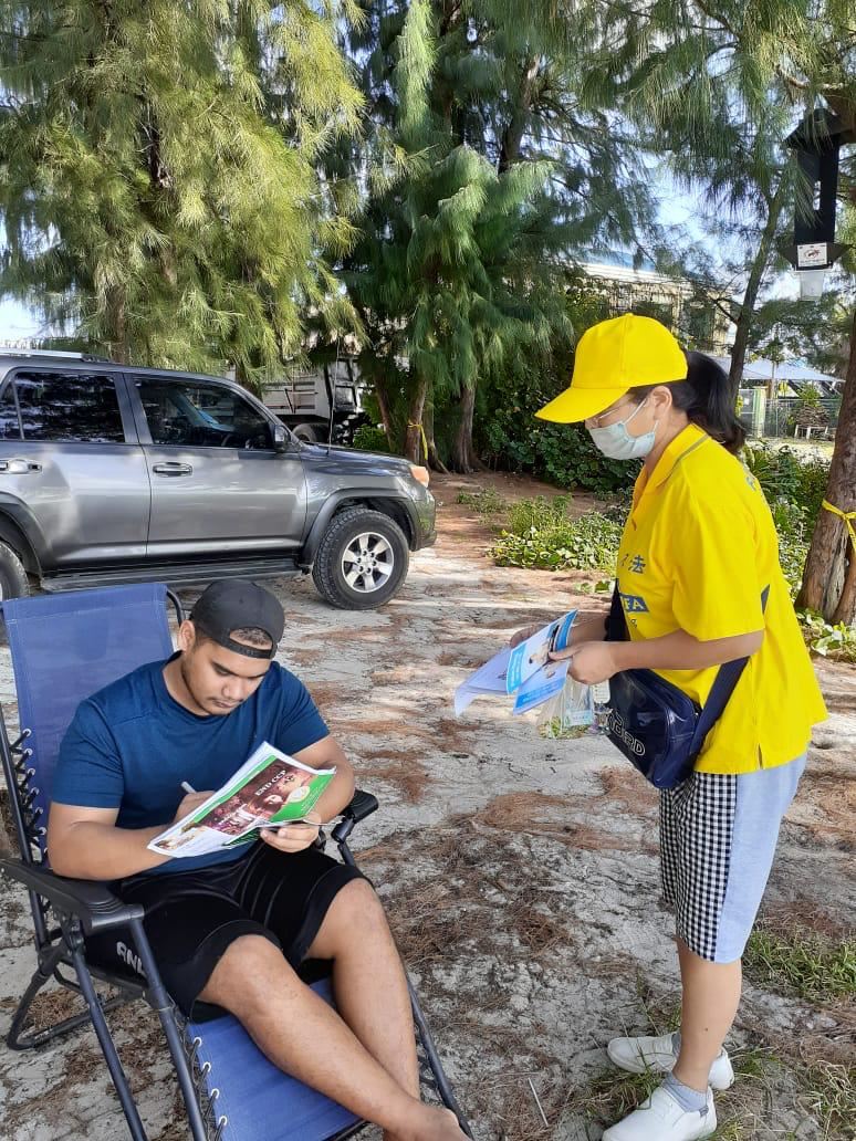 真相车队游行与征签活动同时进行,同修配合十分默契。当地土著人会问CCP到底是什么,它到底干了什么,等等。在征签过程中更多的民众了解了真相:中共暴力活摘法轮功学员器官牟取暴利,中共信仰与人权。民众还了解了中共窃取政权后七十多年来的罪恶,屠杀了无数的中国人。到现在,中共病毒又害死了上百万的无辜世界各族人民,多么值得人们深思啊。