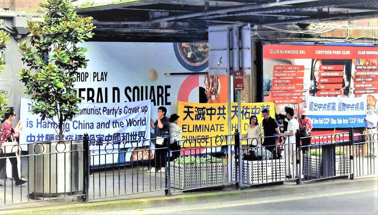 ![]() 图13:十二月十三日法轮功学员在悉尼堪普西(Campsie)主街展横幅和演示功法 |