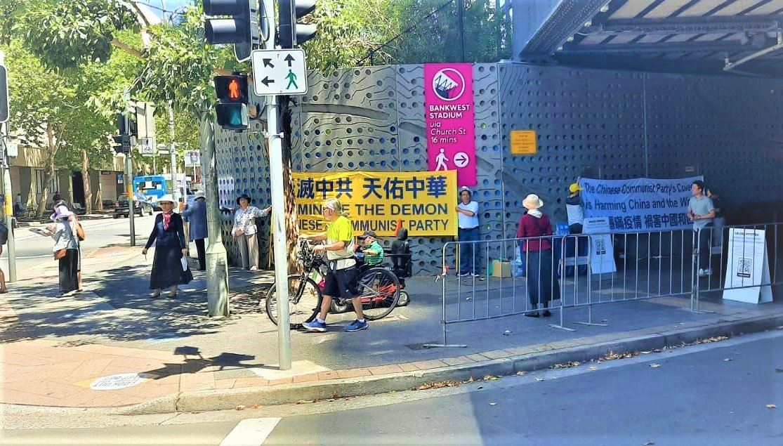 ![]() 图1:十一月十五日法轮功学员在悉尼艾士菲(Ashfield)市政厅前展横幅、讲真相。 |