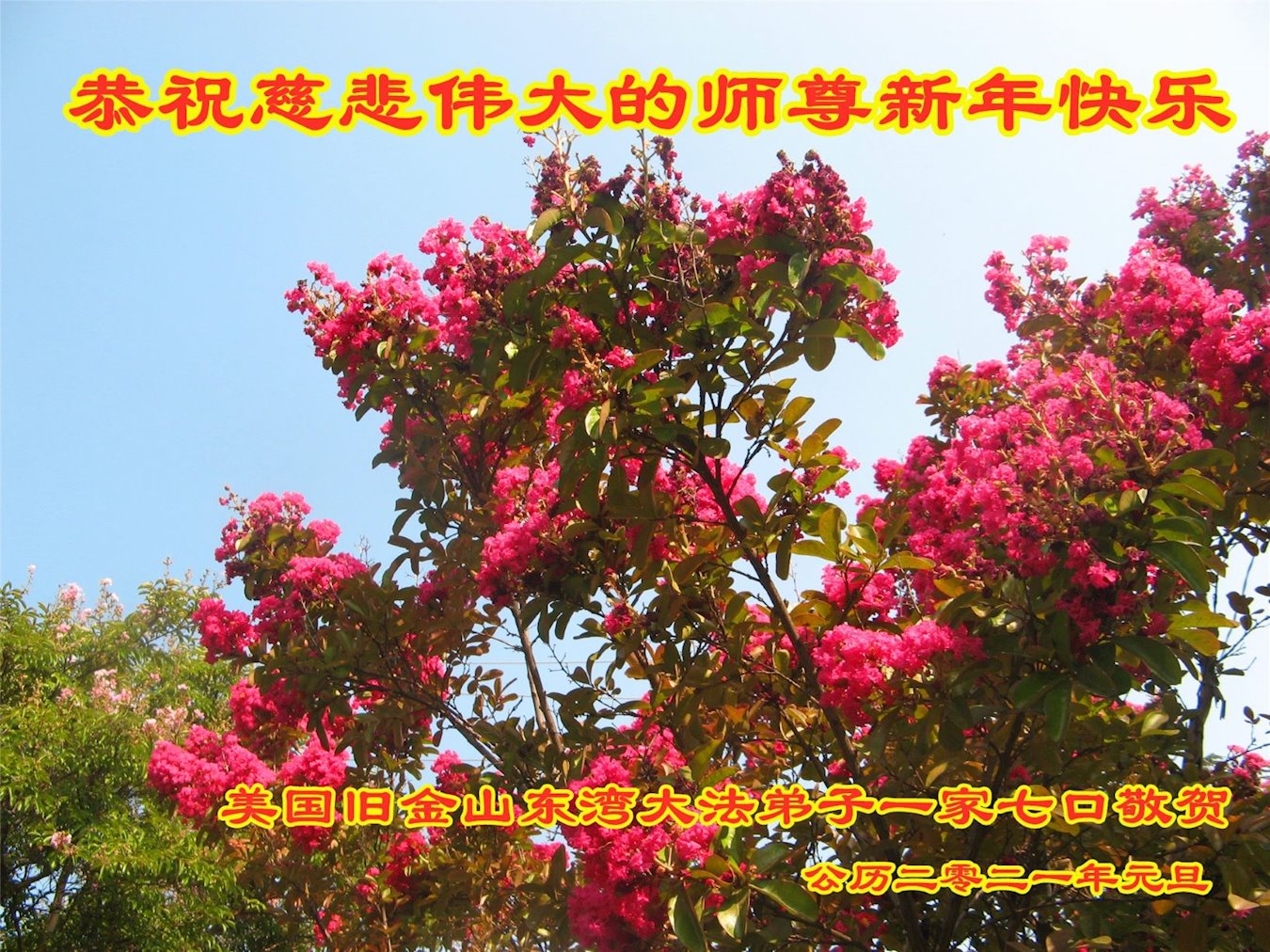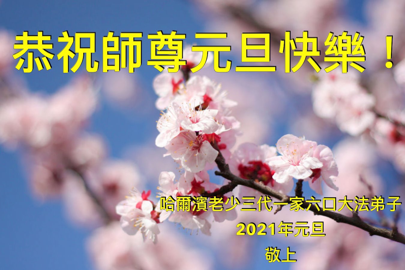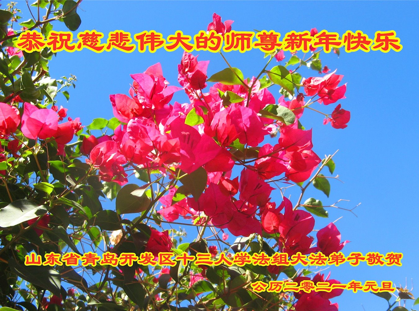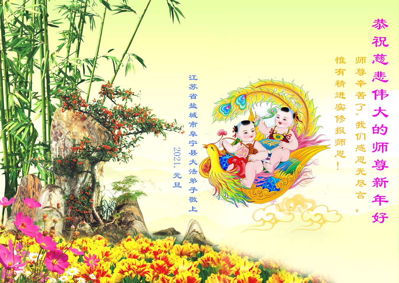 2021年元旦来临,中国大陆30个省和自治区的学法小组的大法弟子们恭祝慈悲的师父元旦快乐!大法弟子们表示,会在最后的修炼路上把握有限时间勇猛精進、兑现誓约,迎来大法的光辉普照天宇人间!