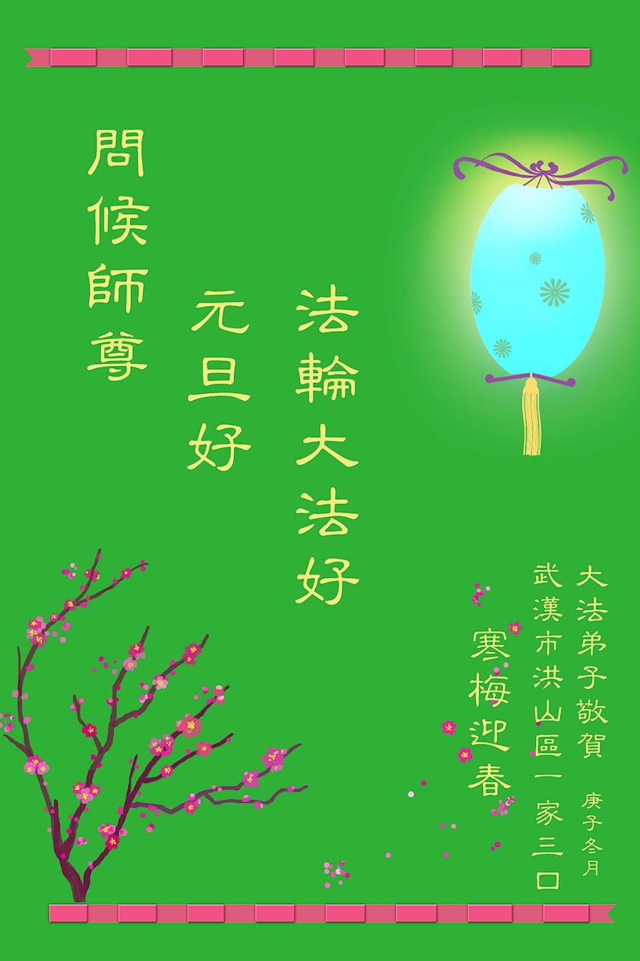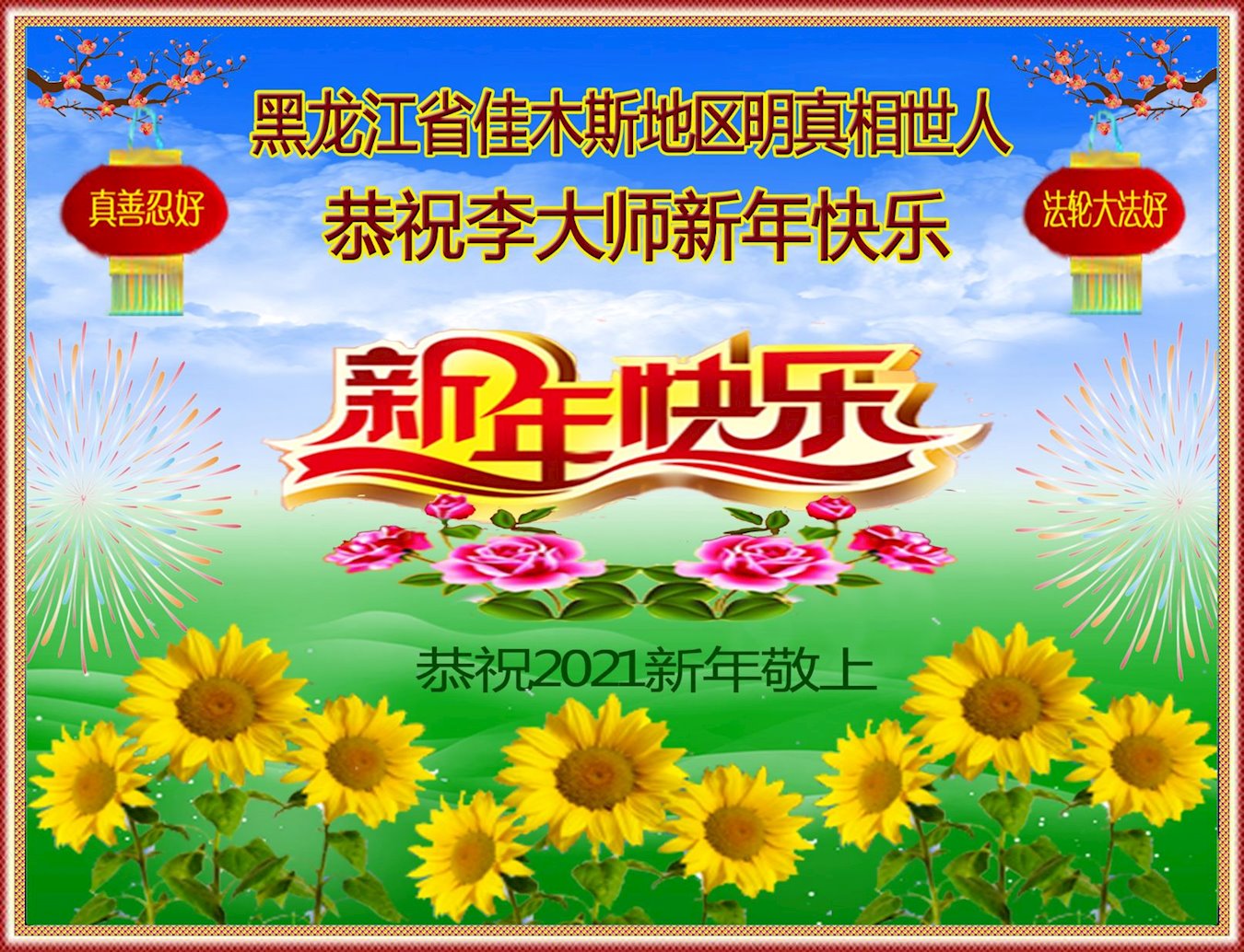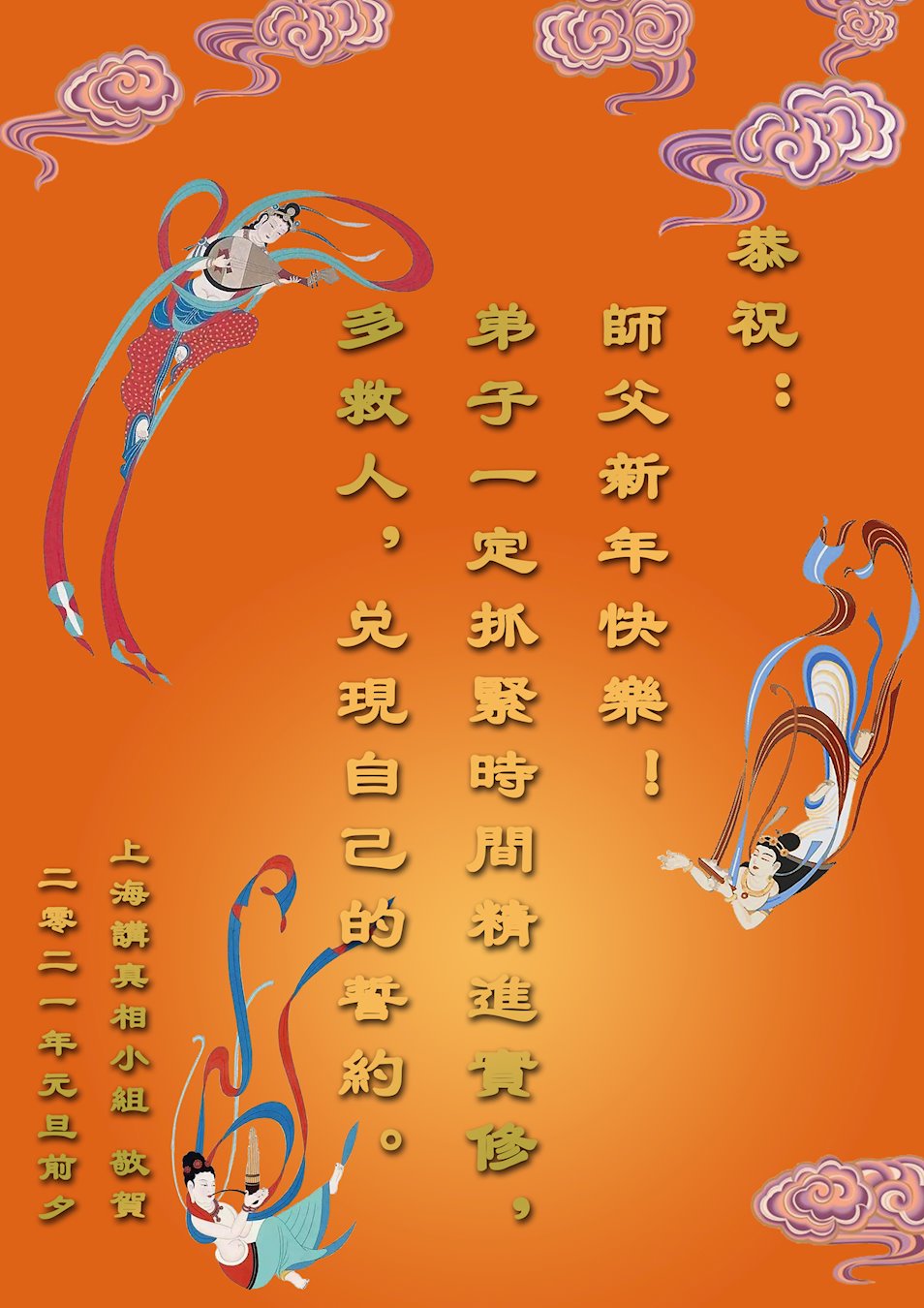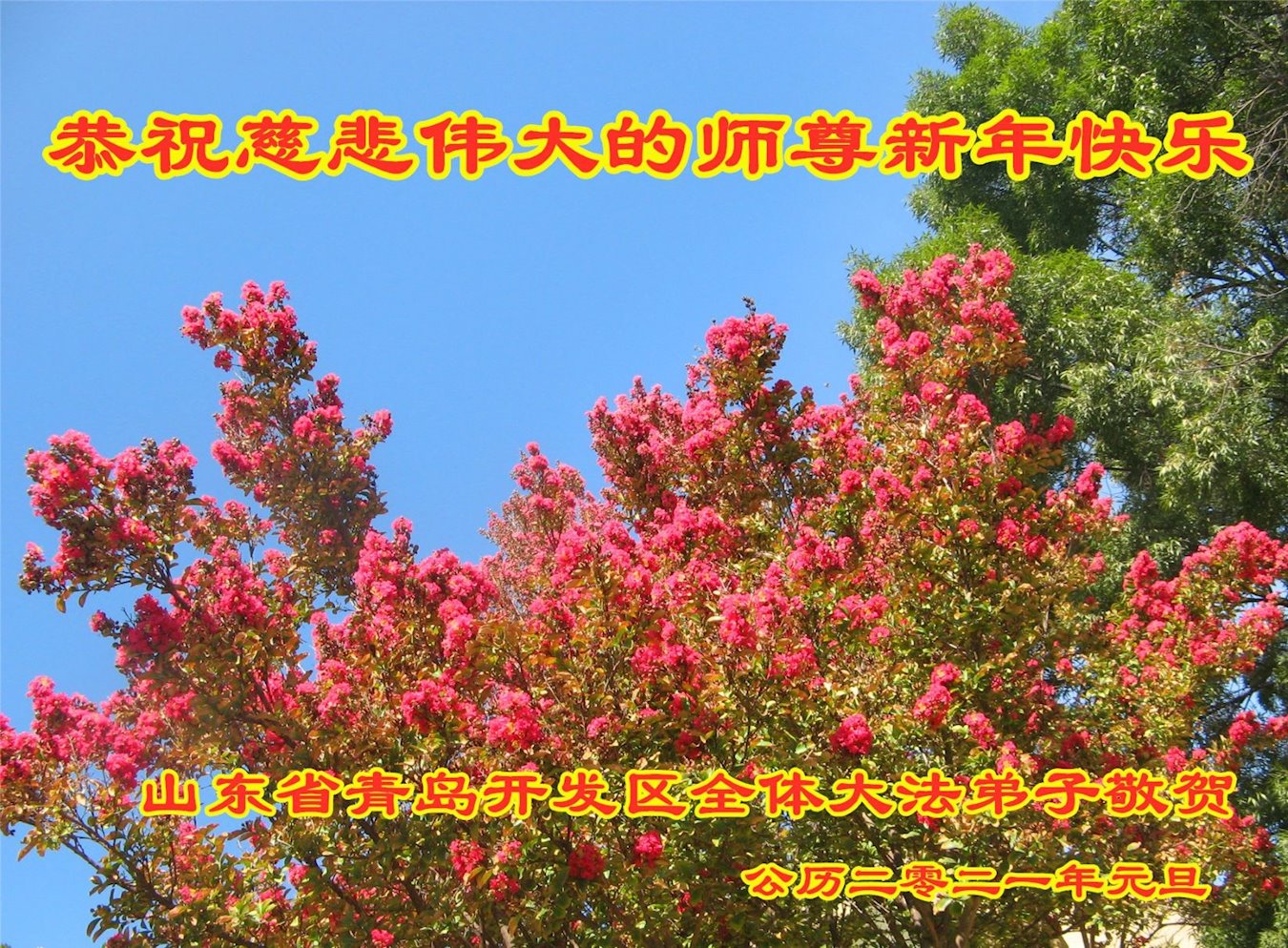 2021年元旦来临,中国大陆30个省和自治区的学法小组的大法弟子们恭祝慈悲的师父元旦快乐!大法弟子们表示,会在最后的修炼路上把握有限时间勇猛精進、兑现誓约,迎来大法的光辉普照天宇人间!