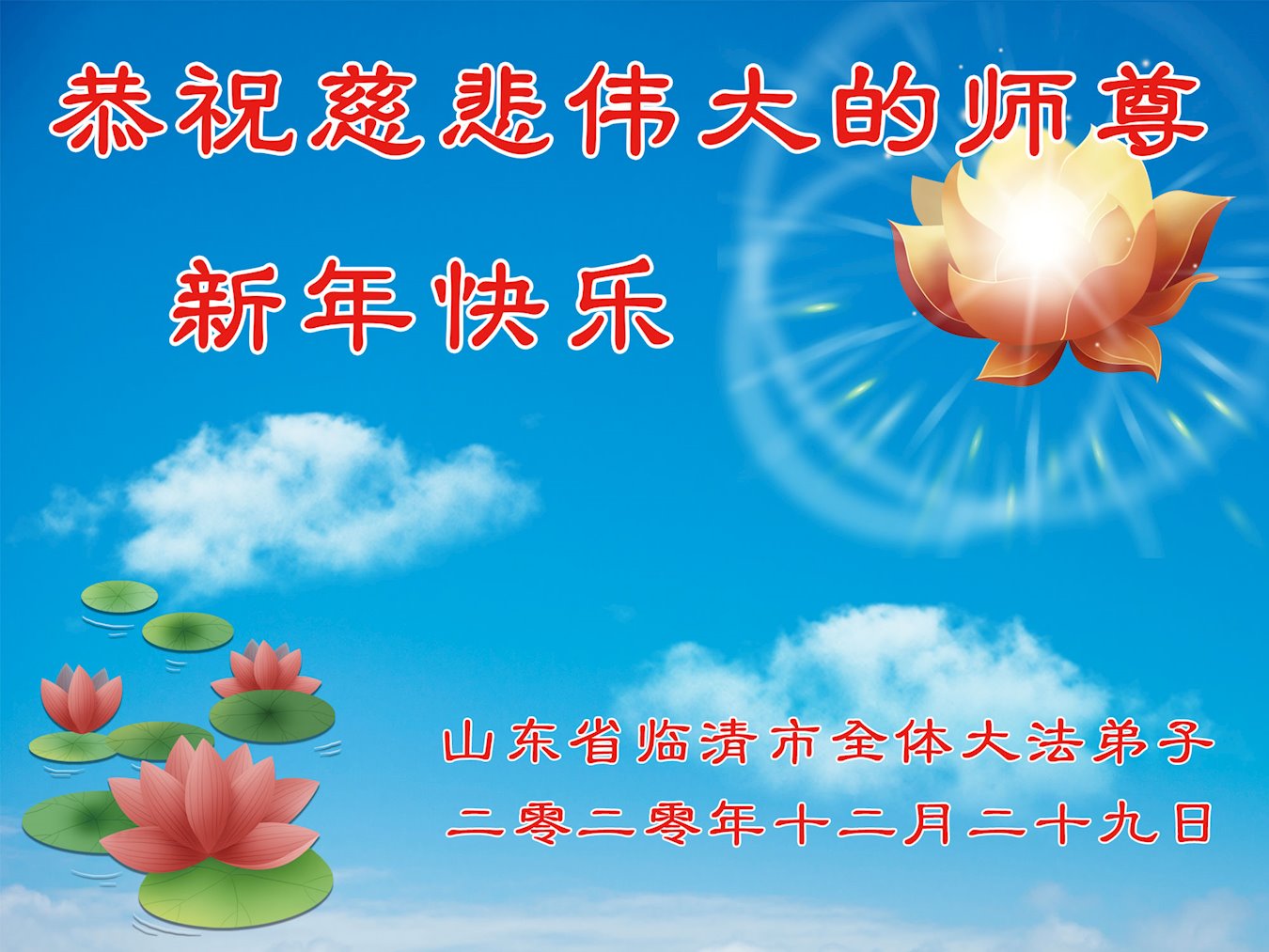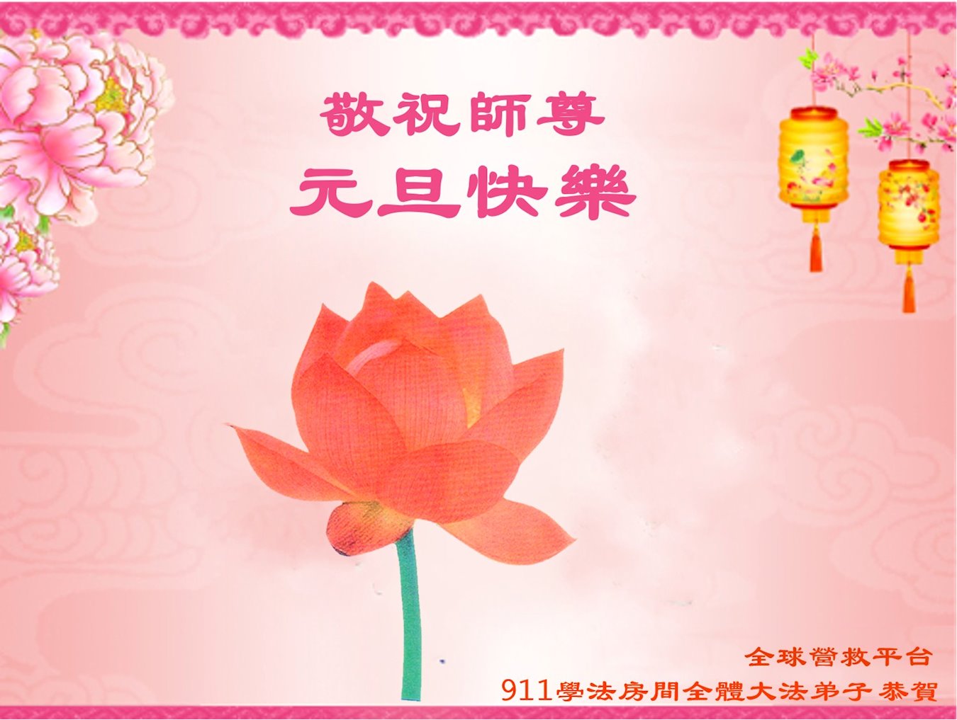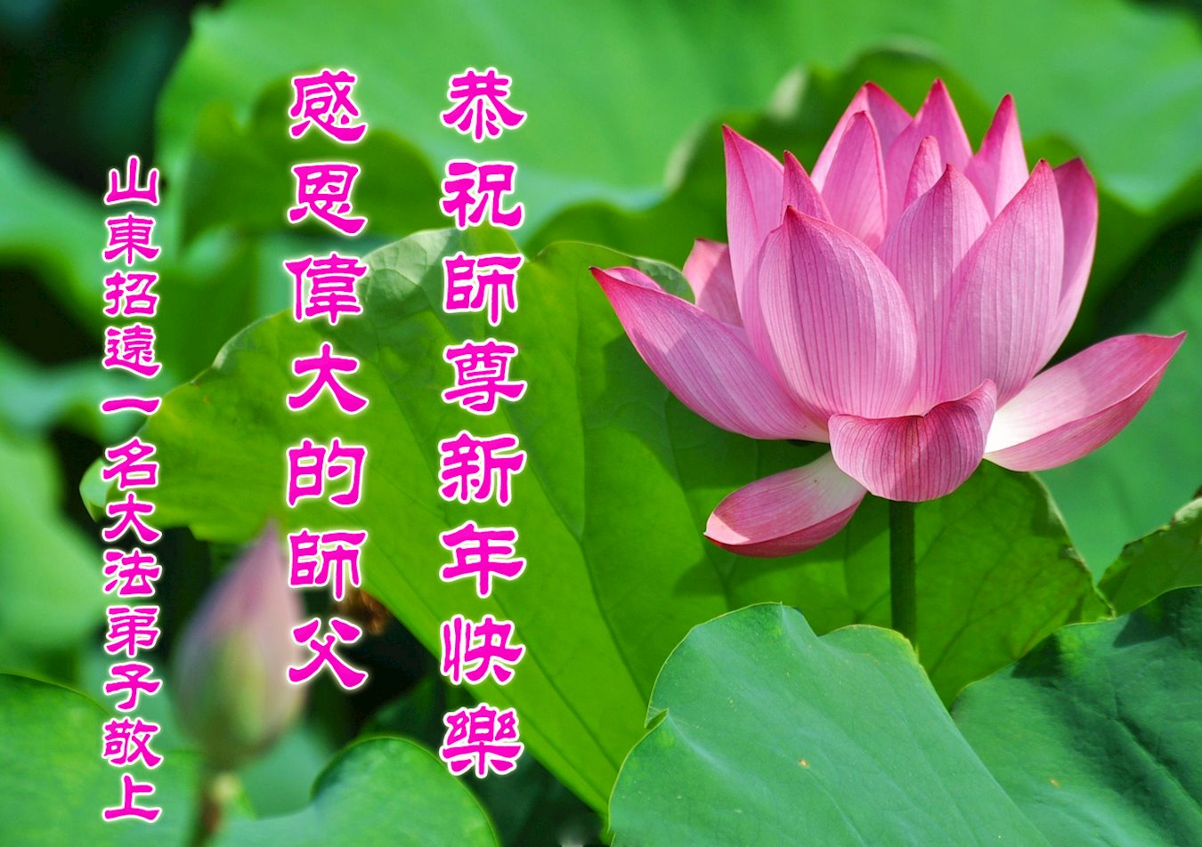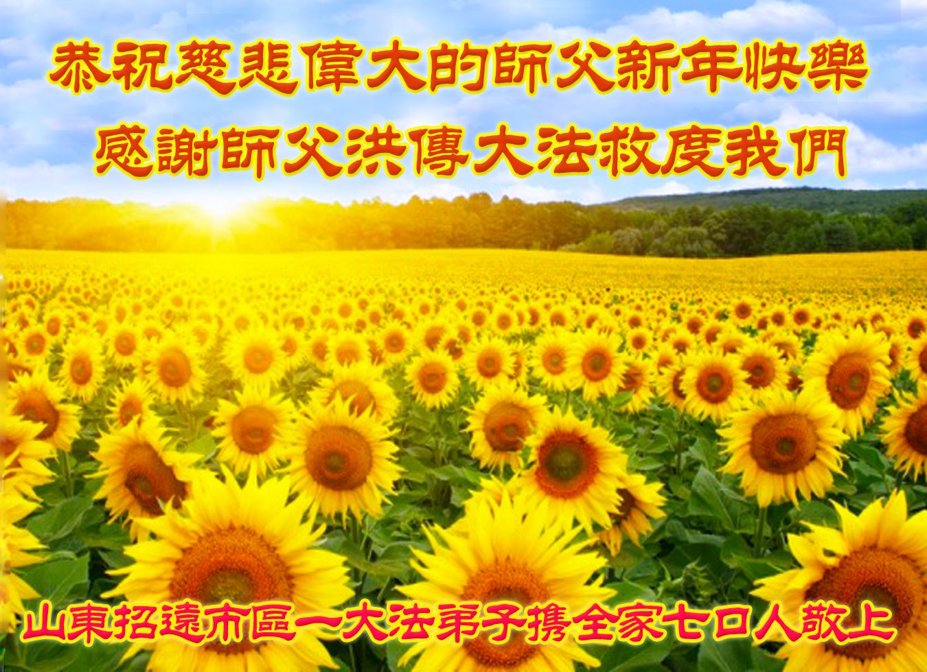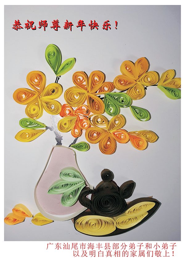 在这佛光普照的日子里,在这与师尊正法同在的伟大、殊胜的日子里,在这最后的选择时期,在这历史更新的短暂时光中,在这新的一年来临之日:弟子恭祝慈悲伟大的师尊新年快乐!师尊您辛苦了!弟子向师尊九叩首!