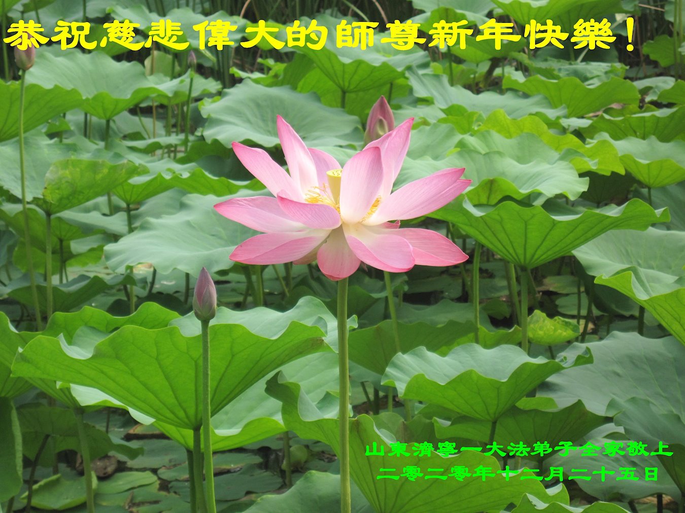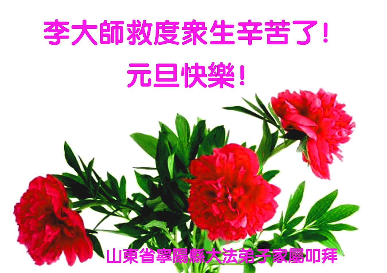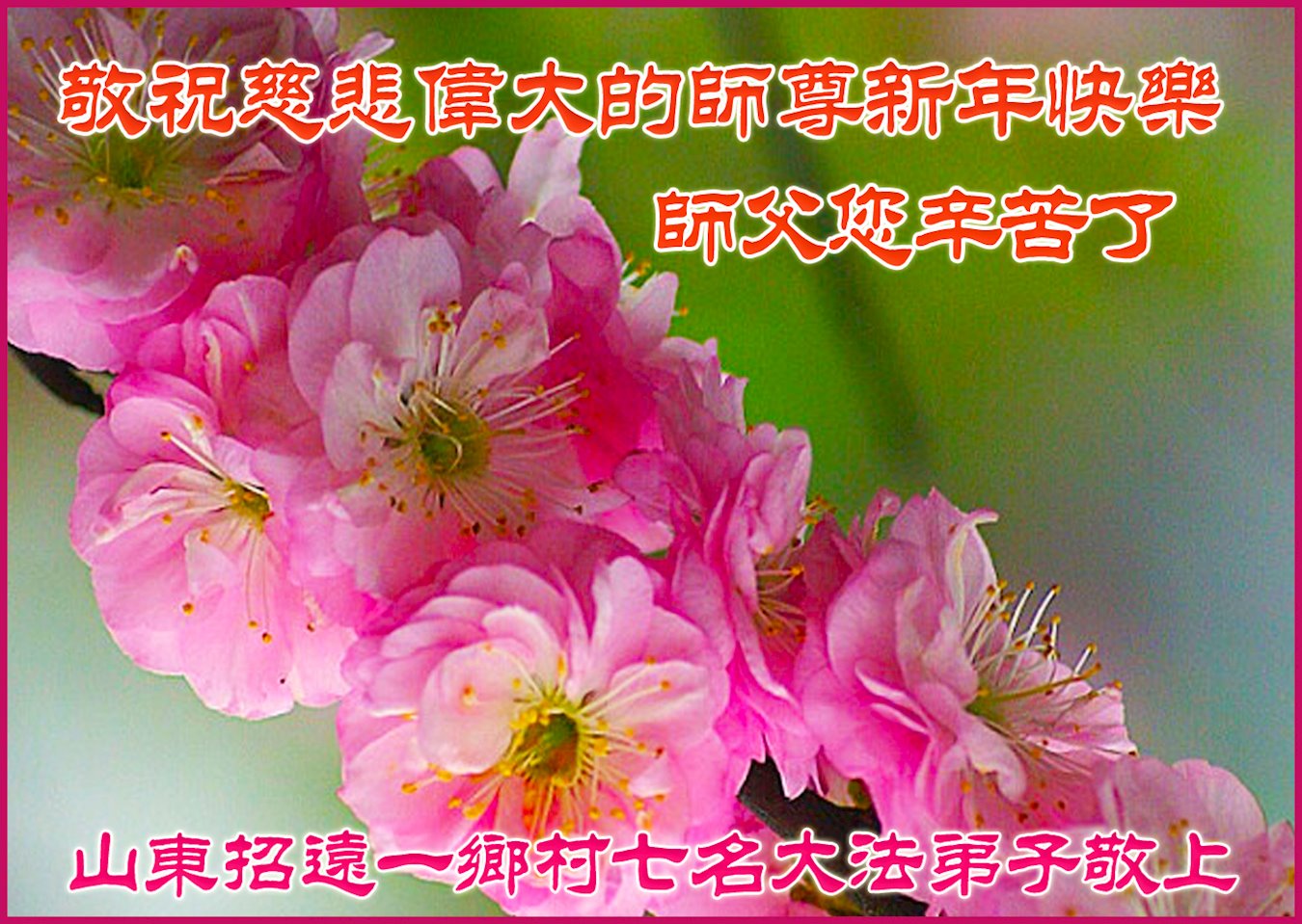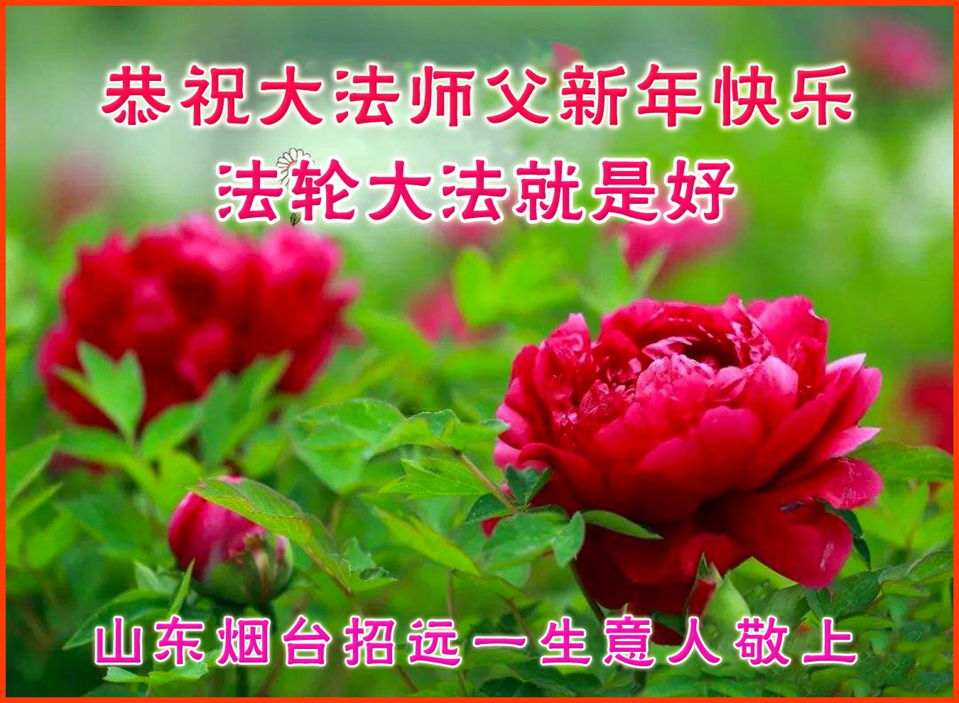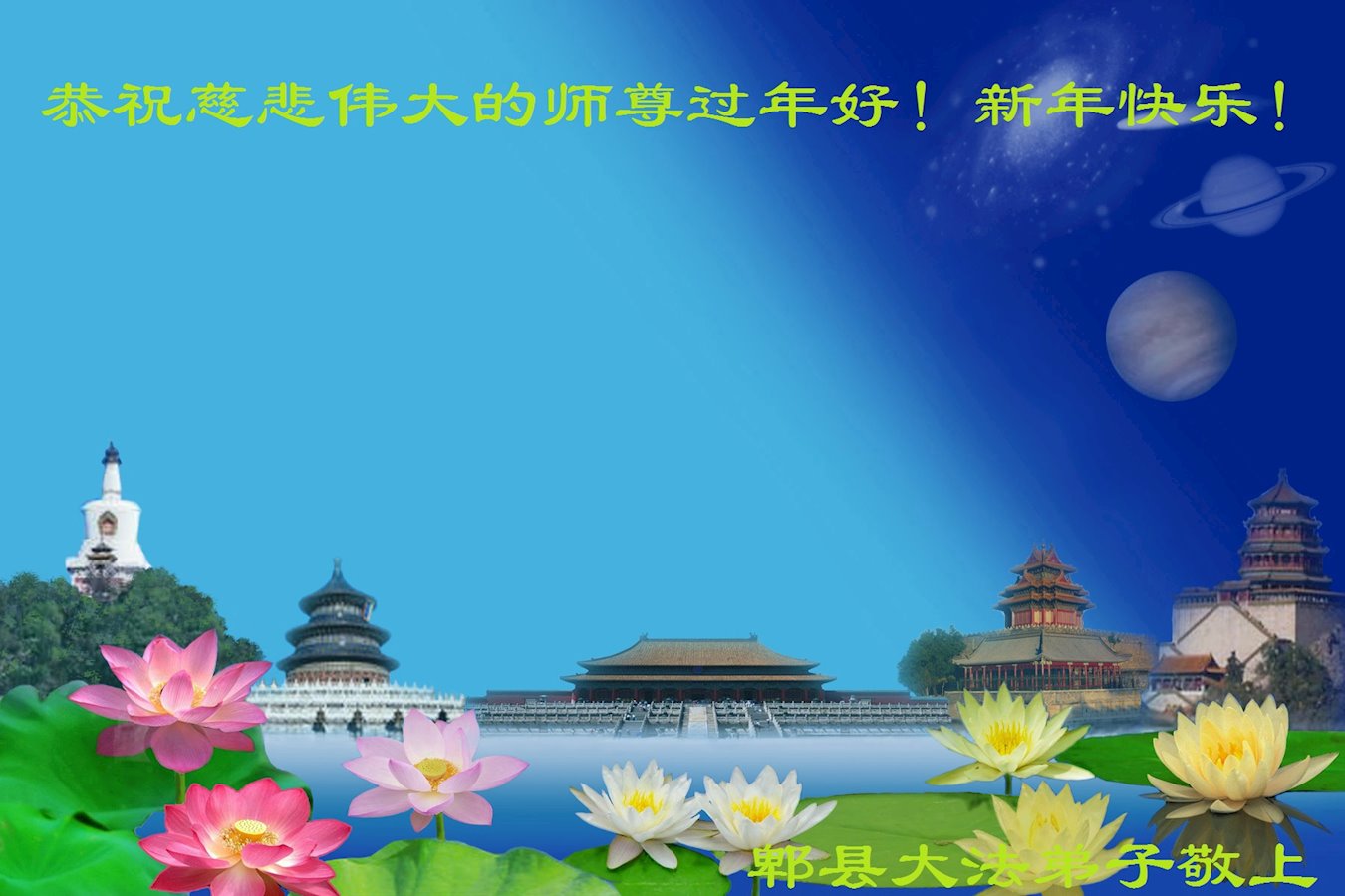 在这佛光普照的日子里,在这与师尊正法同在的伟大、殊胜的日子里,在这最后的选择时期,在这历史更新的短暂时光中,在这新的一年来临之日:弟子恭祝慈悲伟大的师尊新年快乐!师尊您辛苦了!弟子向师尊九叩首!