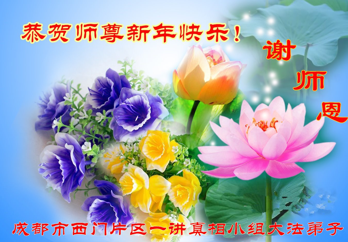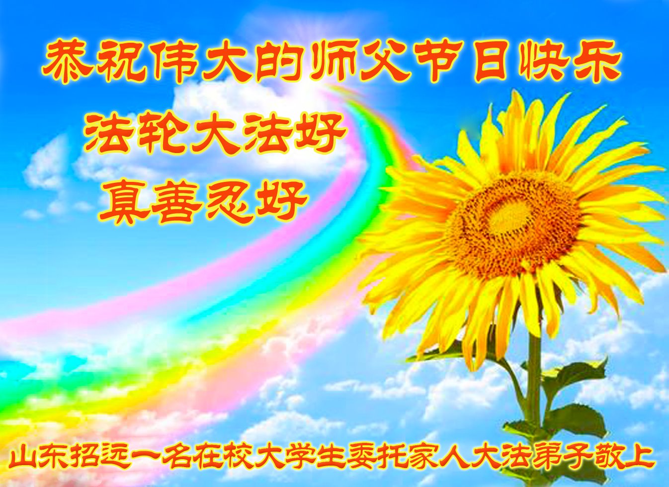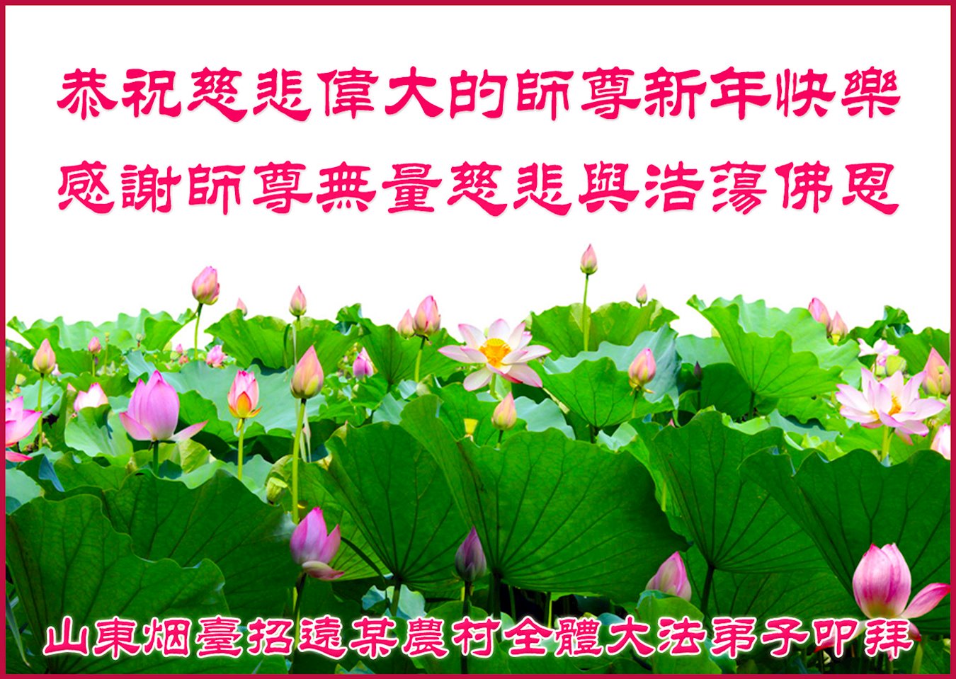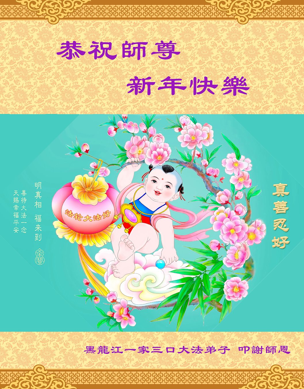 在这佛光普照的日子里,在这与师尊正法同在的伟大、殊胜的日子里,在这最后的选择时期,在这历史更新的短暂时光中,在这新的一年来临之日:弟子恭祝慈悲伟大的师尊新年快乐!师尊您辛苦了!弟子向师尊九叩首!