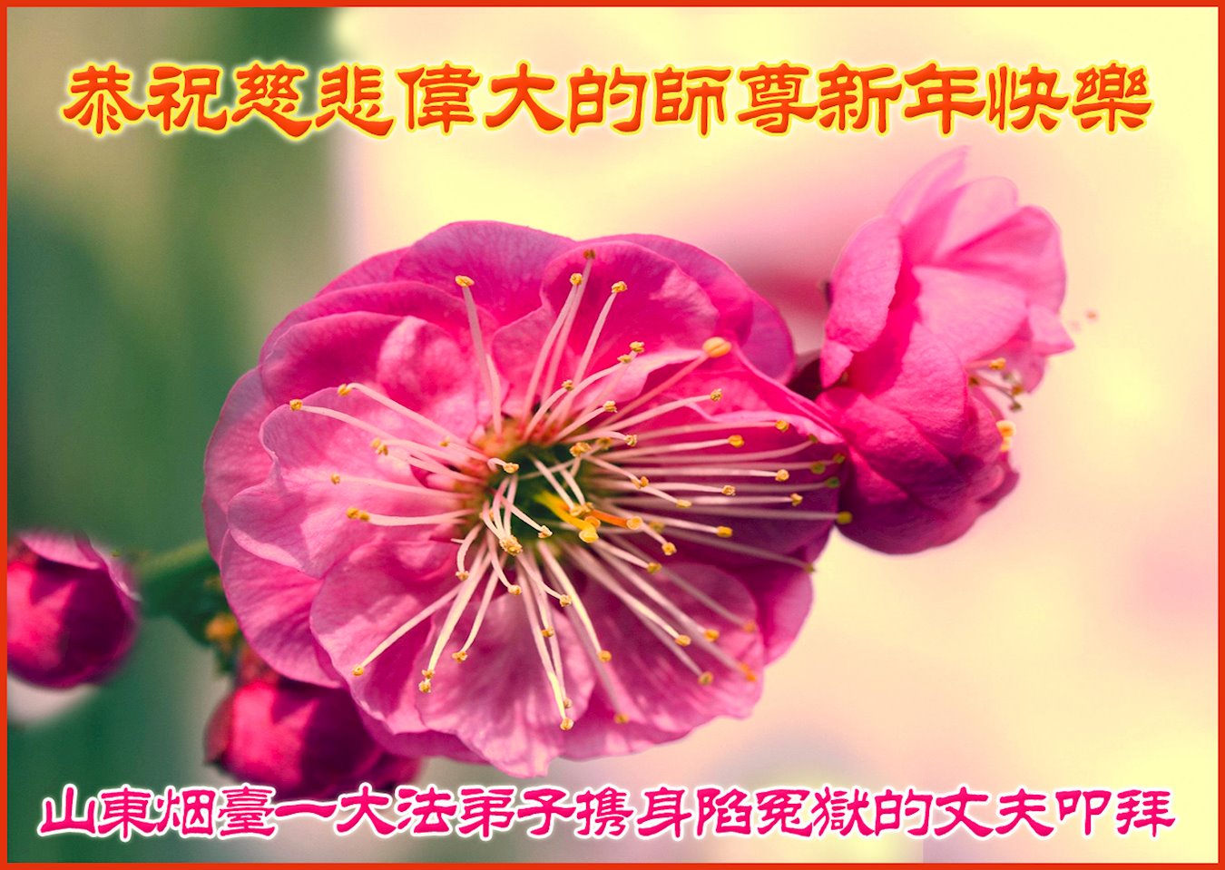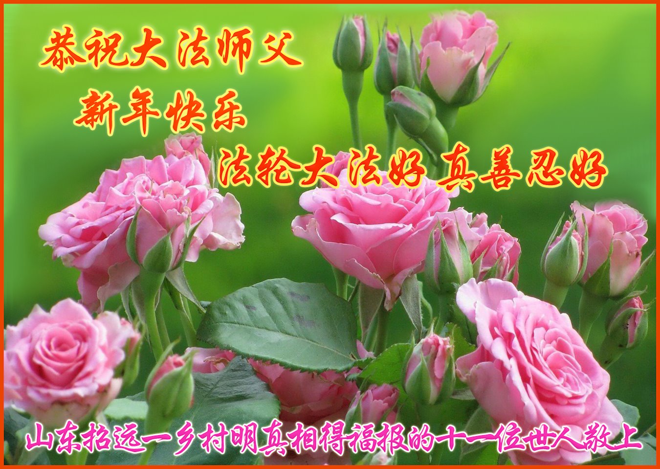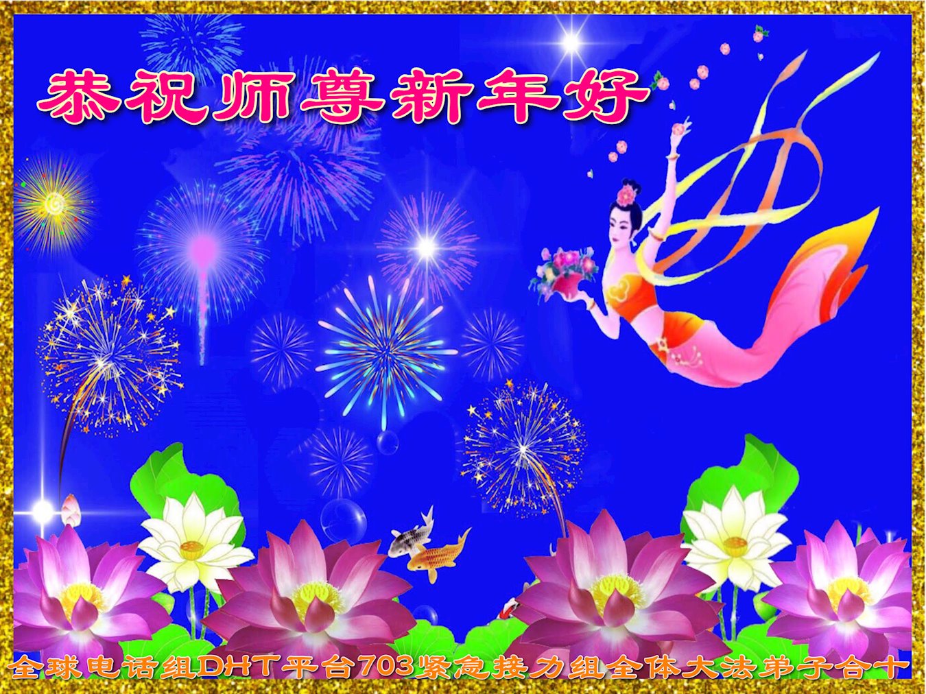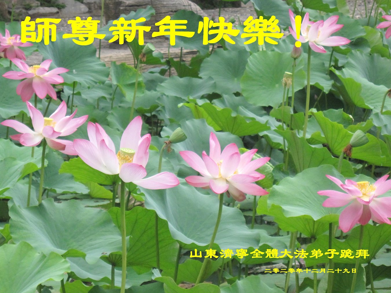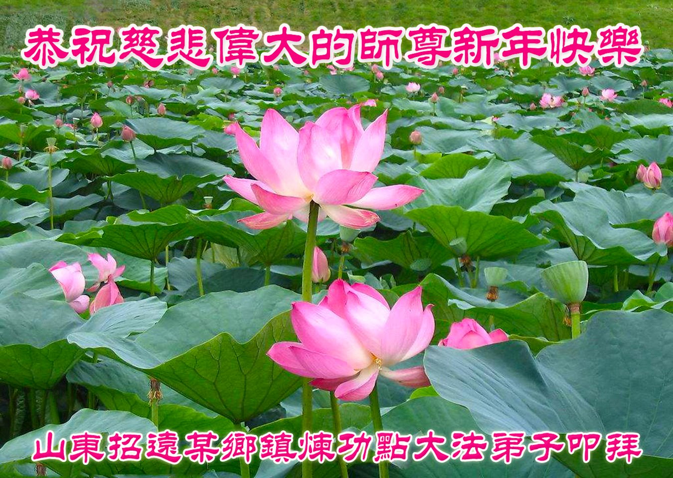 在这佛光普照的日子里,在这与师尊正法同在的伟大、殊胜的日子里,在这最后的选择时期,在这历史更新的短暂时光中,在这新的一年来临之日:弟子恭祝慈悲伟大的师尊新年快乐!师尊您辛苦了!弟子向师尊九叩首!