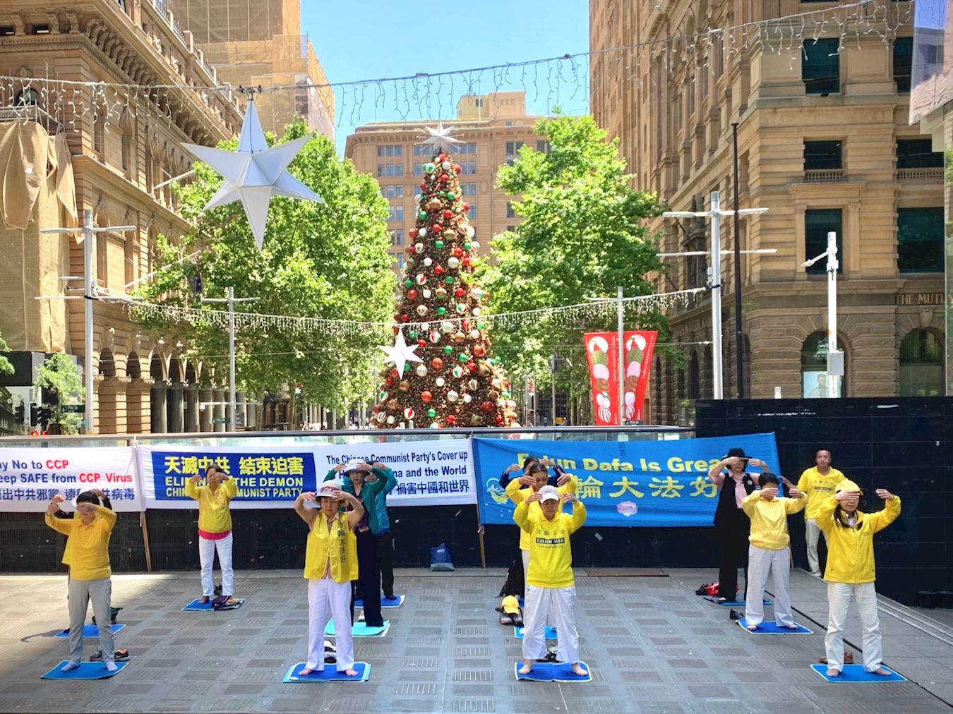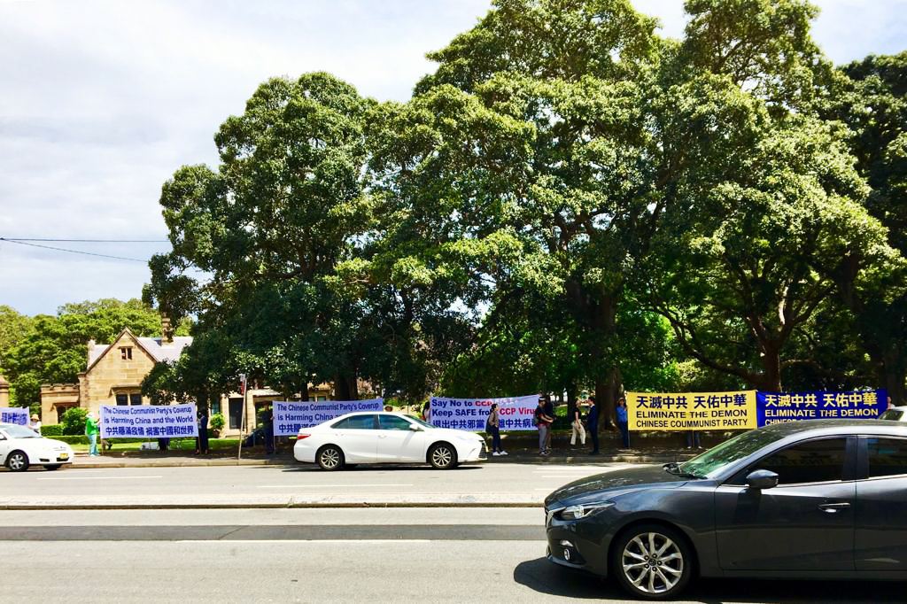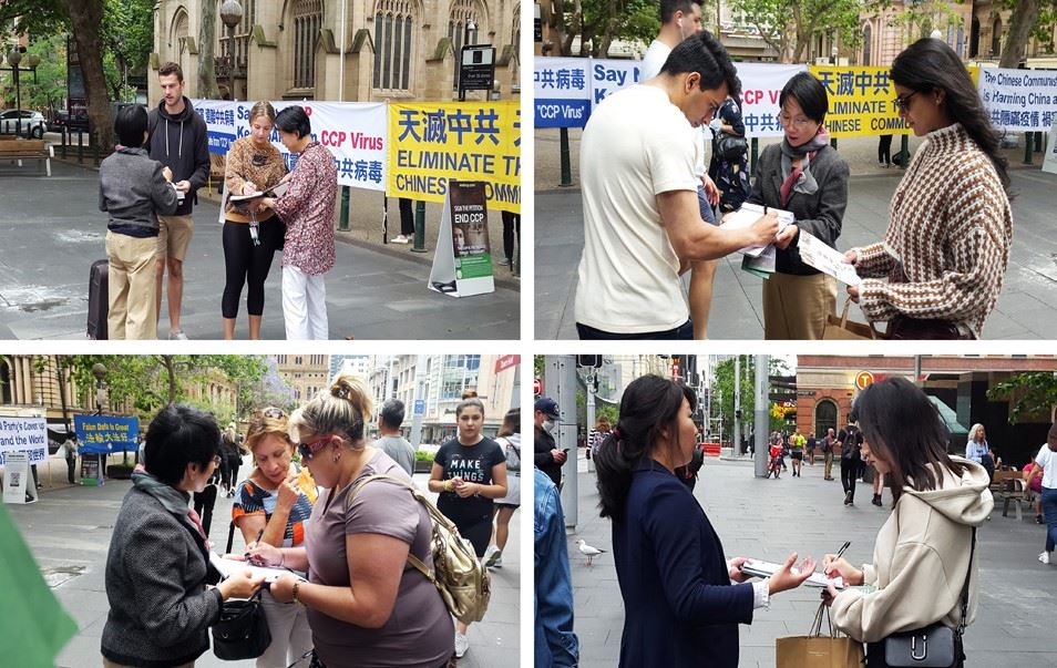 ![]() 图1:部份法轮功学员在悉尼市政厅(Town Hall)前举横幅,呼吁民众签名支持“结束中共”和讲真相 |
