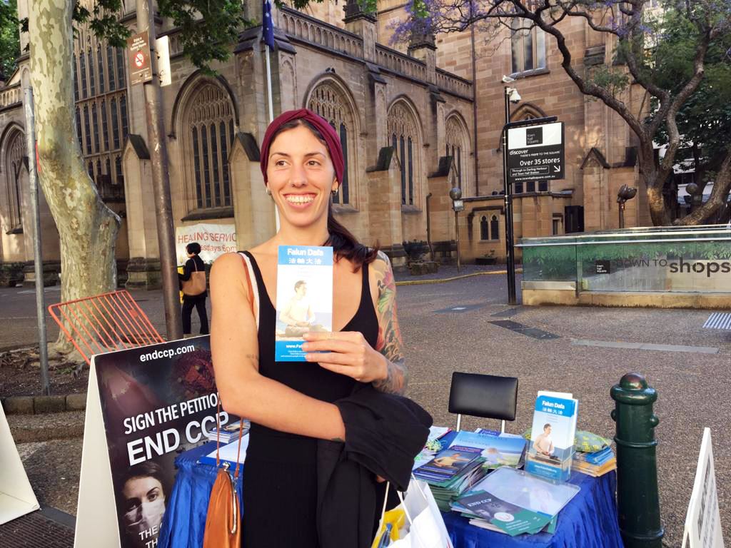 十月二十九日,在悉尼市政厅(Town Hall)前有一位来自意大利的糕点师玛缔娜(Martina)是第一次听说法轮功。她认为:法轮功是很好的打坐养生方法。但是因为在中国很多人学炼,这令中共极权深感恐惧,因为他们担忧会威胁其独裁统治,所以开始迫害信仰真、善、忍的好人。