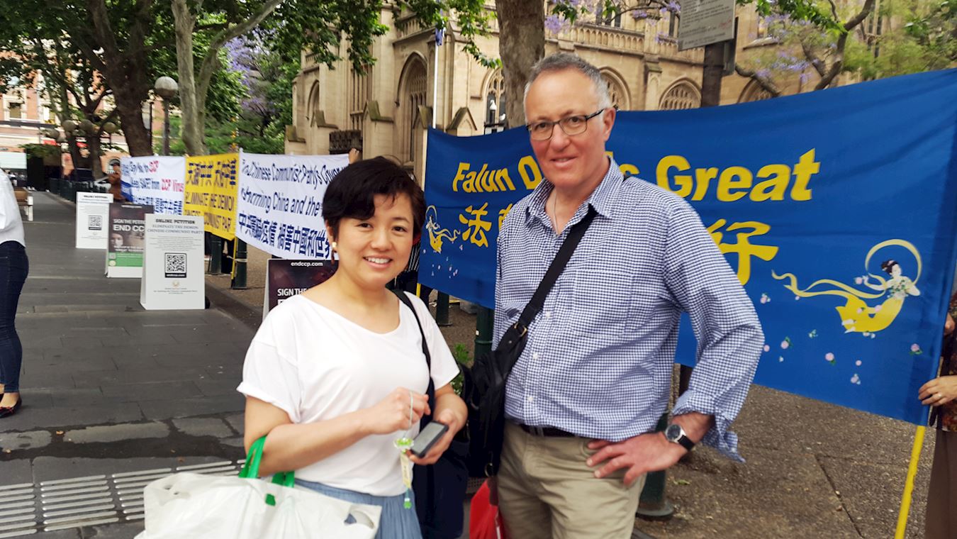 从悉尼近郊巴瑟斯特(Bathurst)城开车三小时来到悉尼的日本女士洋子(Yoko)和西蒙·佩奇(Simom Paige)走过真相横幅,他们驻足阅读并签名支持“解体中共”。