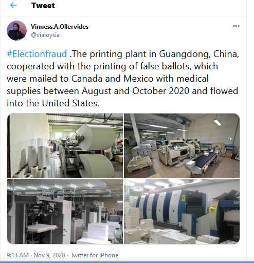 伊启威11月9日在推特上发帖说:“中国广东省的印刷厂在帮助印刷假选票,这些选票于2020年8月至10月之间以医疗用品的名义邮寄到加拿大和墨西哥,然后流入美国。”