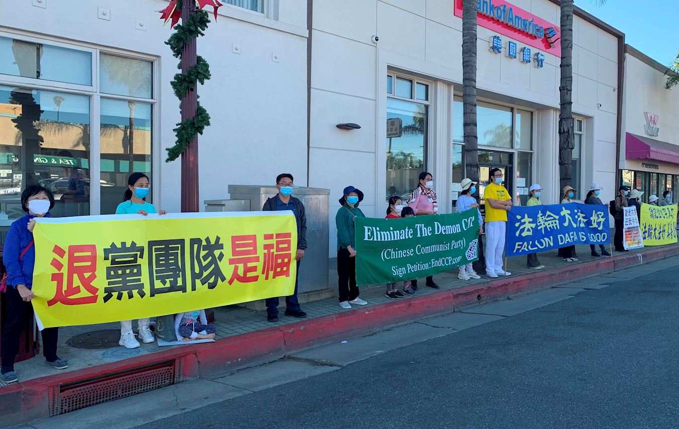 *党-、团、队。'>图1:法轮功学员在洛杉矶华人聚集区的蒙特利公园市举办活动,声援3亿6千8百多万中国人退出中共邪*党-、团、队。 |