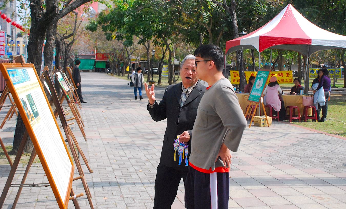 学员举办的活动有“法轮功功法演示”、“丰收节庆的腰鼓舞”、“纸莲花教作”、“全世界控告江泽民迫害法轮功征签”等,现场还摆放图文并茂的真相展板,内容呈现大法美好、揭露中共迫害法轮功的事实。节目主持人向告诉民众:“心中牢记真善忍,洪福常伴善良人。”公园里充满祥和热闹的气息。