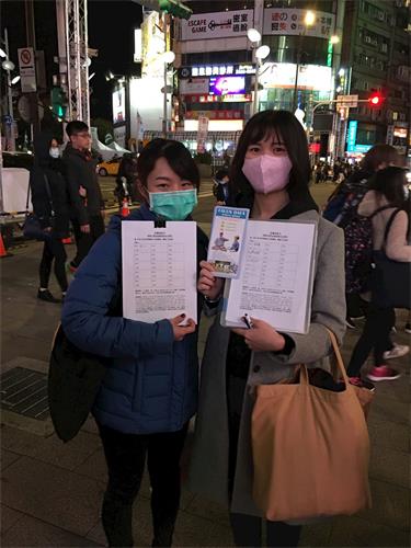 李彦霖在被分配到西门町讲真相与征签,他表示,在征签过程中,他没有分别心,看到人就讲,就算被拒绝多次,内心也很平静。他和一位香港人聊到香港反送中的事,当向对方谈到法轮功的真相时,对方表示理解,也在香港听闻很多。由此,让他感佩香港同修做的努力。