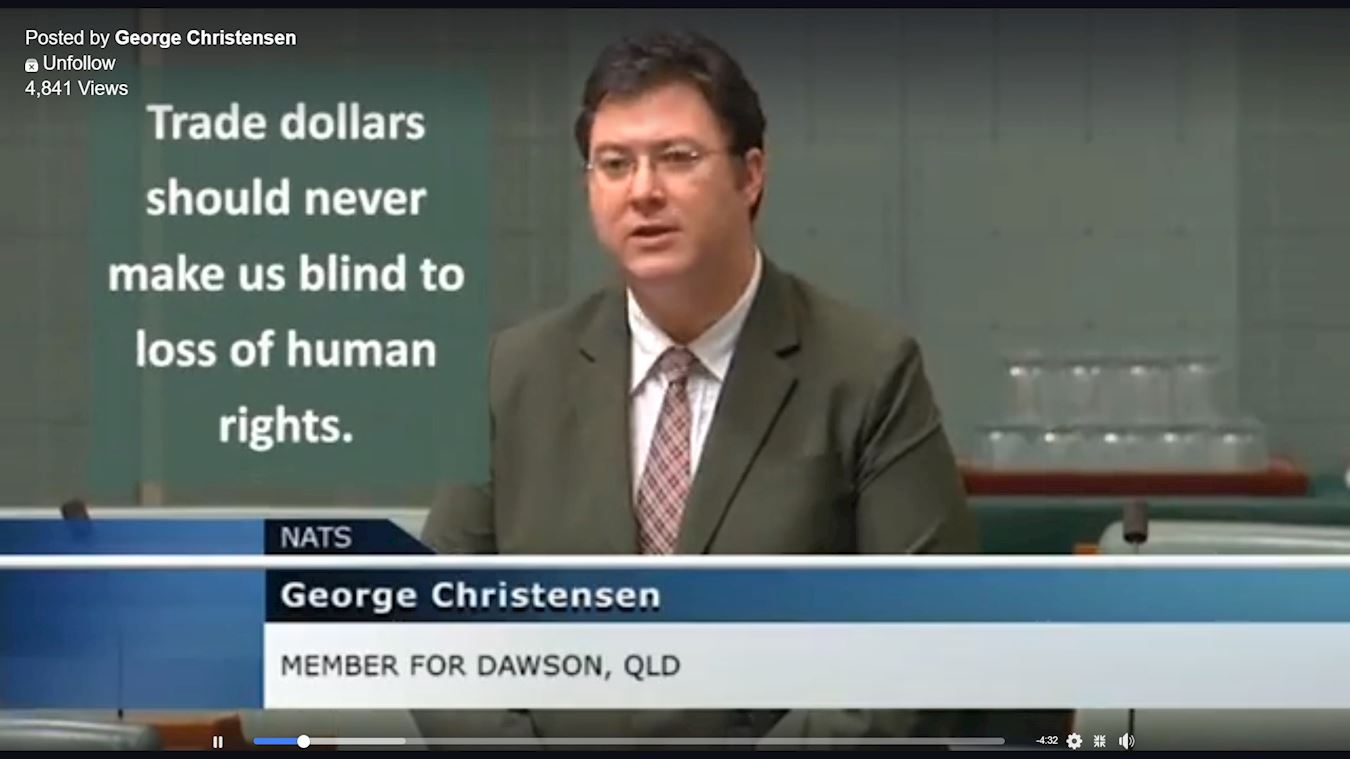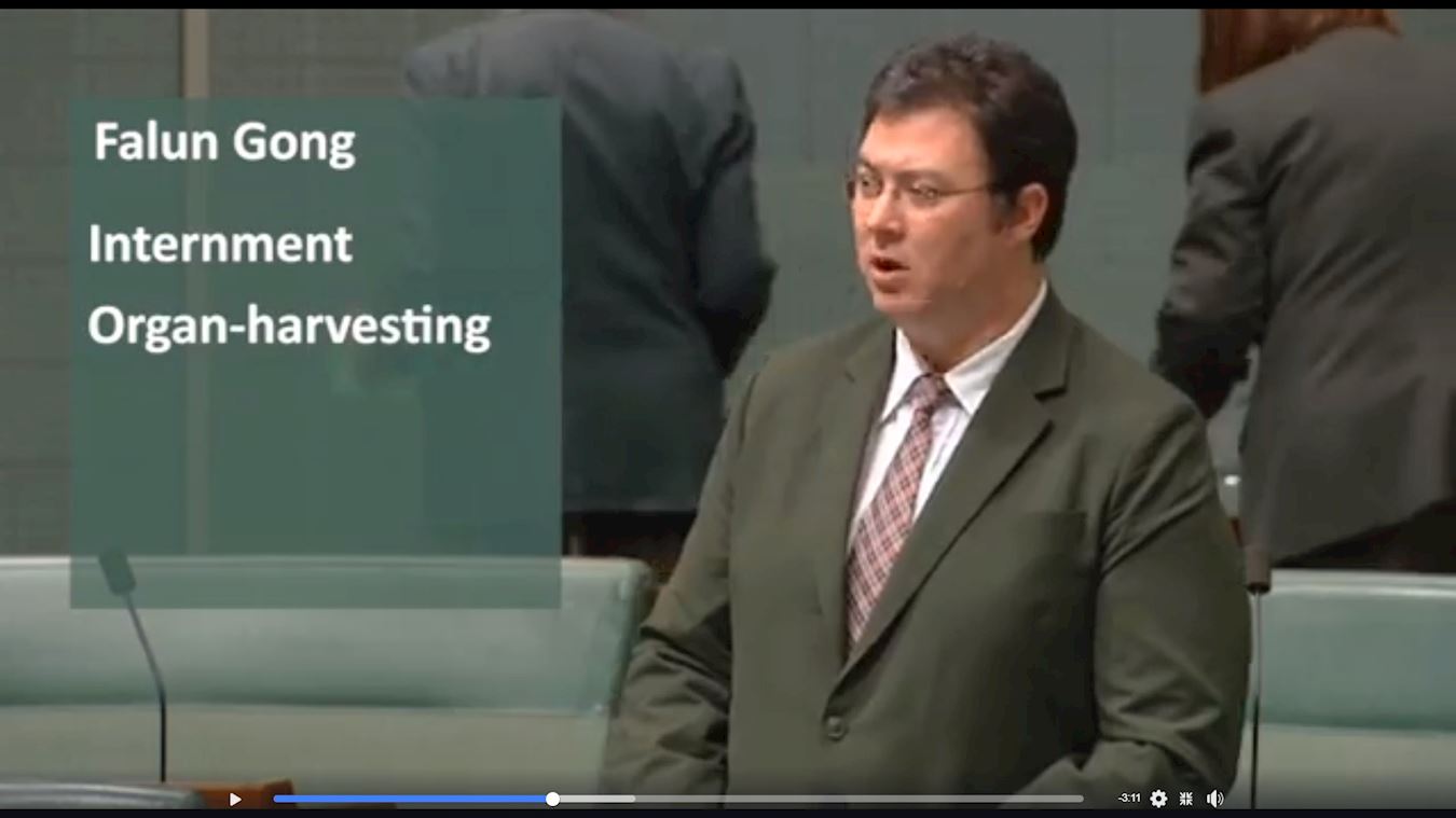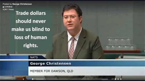 ![]() 图2~3:二零一八年六月,澳洲联邦议员乔治克里斯滕森(George Christensen)在议会发言中揭露中共对法轮功等信仰团体的迫害以及对澳洲各方面的渗透。图为议会发言视频截图。 |