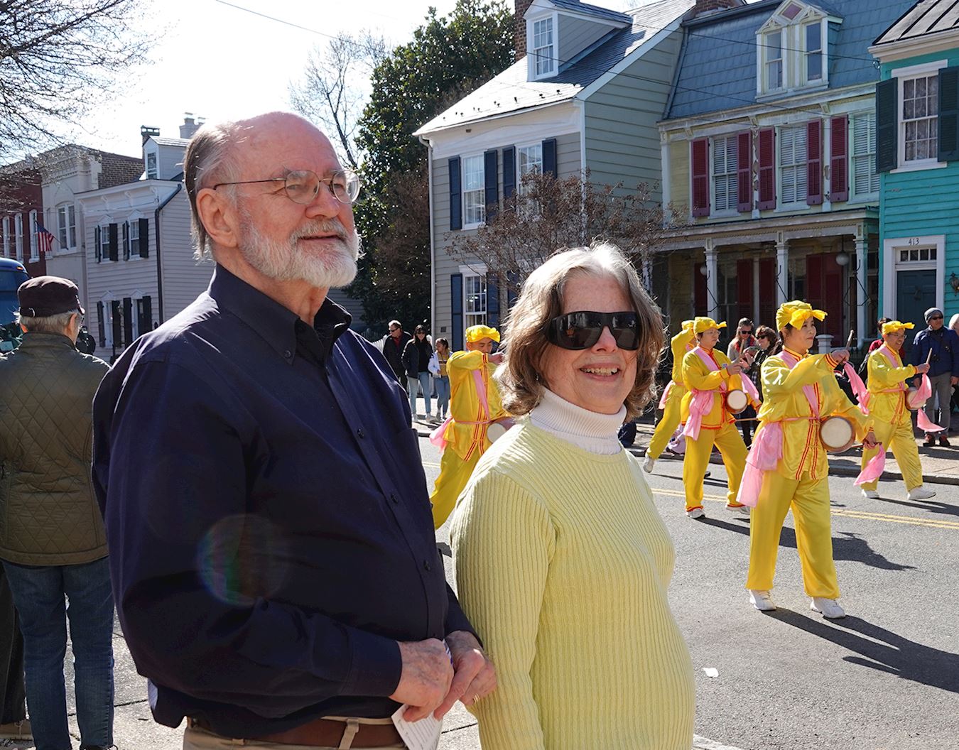比尔(Bill)和太太格温(Gwen)被花车上的“真善忍”三个字深深吸引。比尔说:“‘真善忍’非常好,这当然是指引人前行的正确的价值观。”他的太太格温补充说:“‘真善忍’这三个字带给我们精神启迪,真的太棒了!我以前知道打坐有助于缓解压力,今天第一次听说‘内修’的功法。”比尔夫妇表示,他们希望了解更多法轮大法的信息。