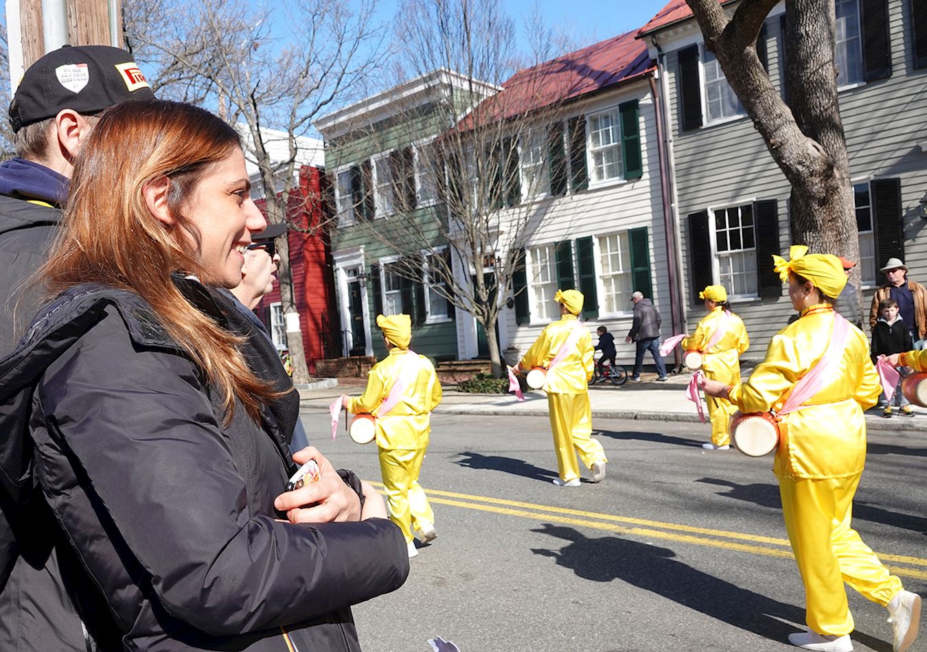 尤莉亚(Yulia)和父母从乌克兰来美国旅游,特意赶来观看游行。他们一家人伴随着腰鼓队的音乐有节奏地拍手。尤莉亚说:“我觉得(法轮功的游行队伍)非常美,很平和,我们很感谢他们参加游行。”
