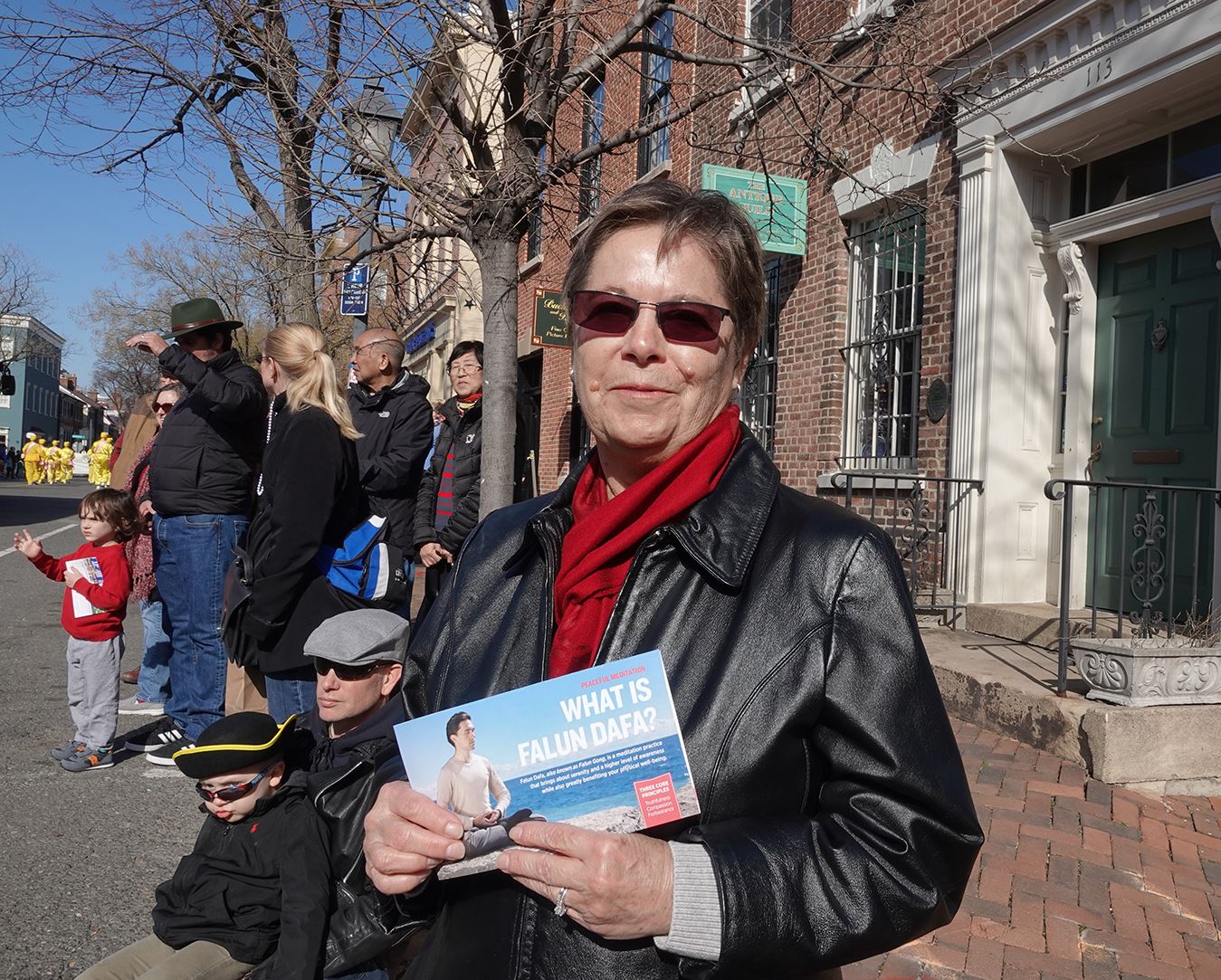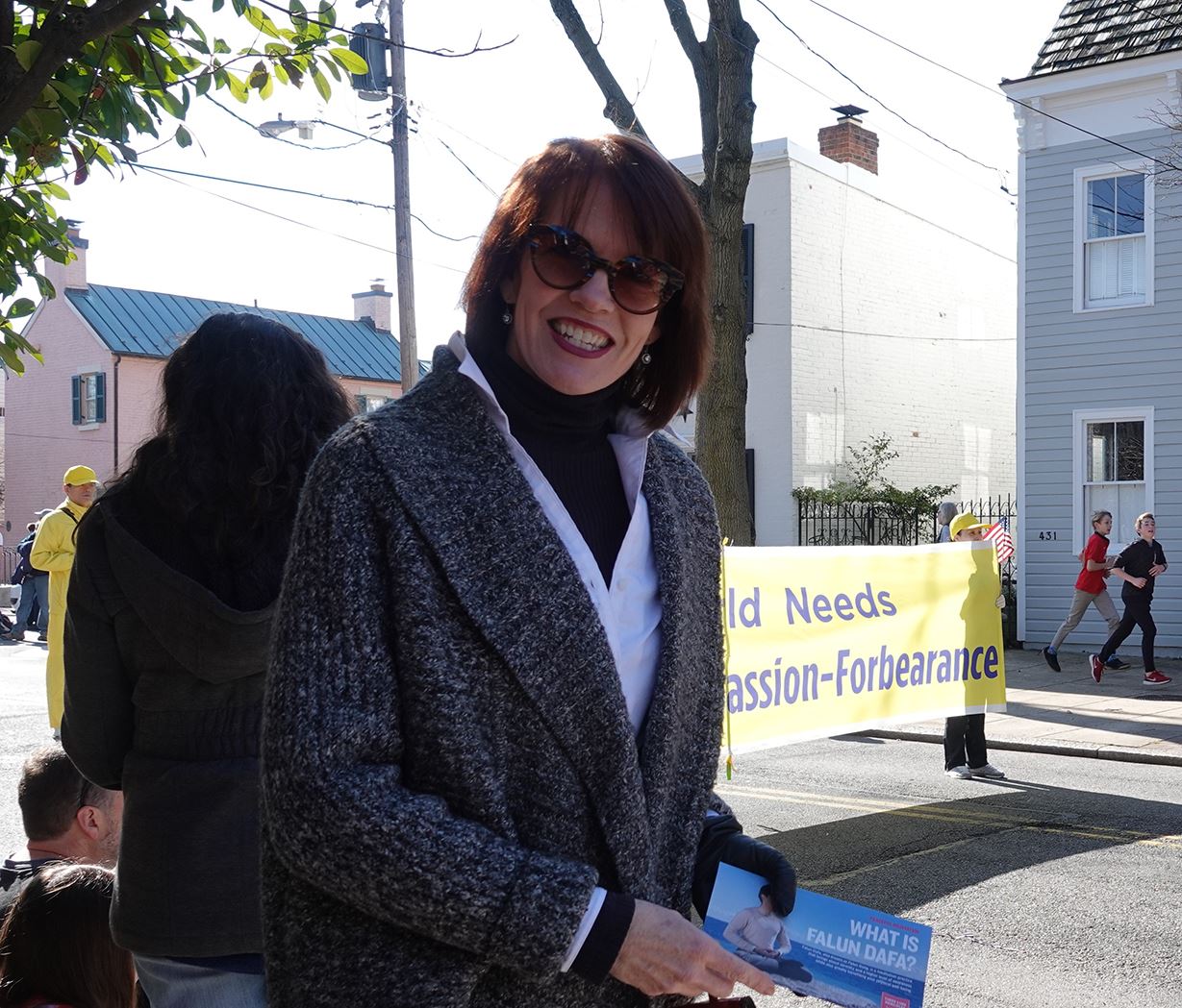 当地的一位商业主管劳拉(Laura)和先生一起来观看游行。劳拉说:“法轮功学员的游行队伍令人愉悦,心情舒缓,他们放慢节奏,静心打坐,带给我们正能量。”
