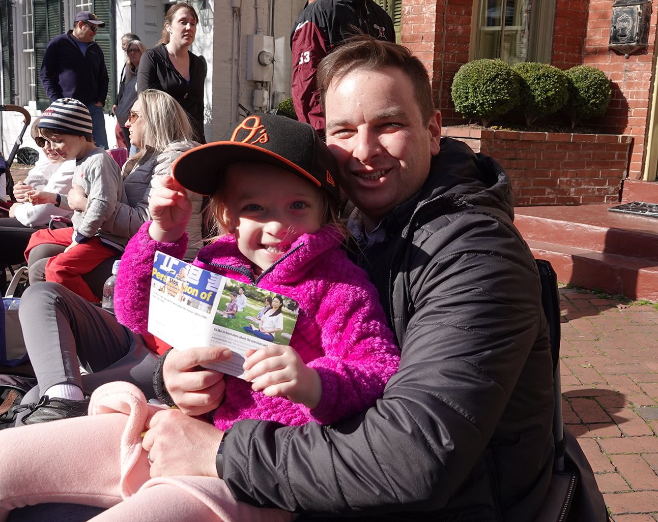 弗莱德(Fred)带着女儿一起观看游行。他说:“我听说过法轮大法,我知道他们带给人健康和正念,他们传递的‘真善忍’信息太好了,非常正面。”