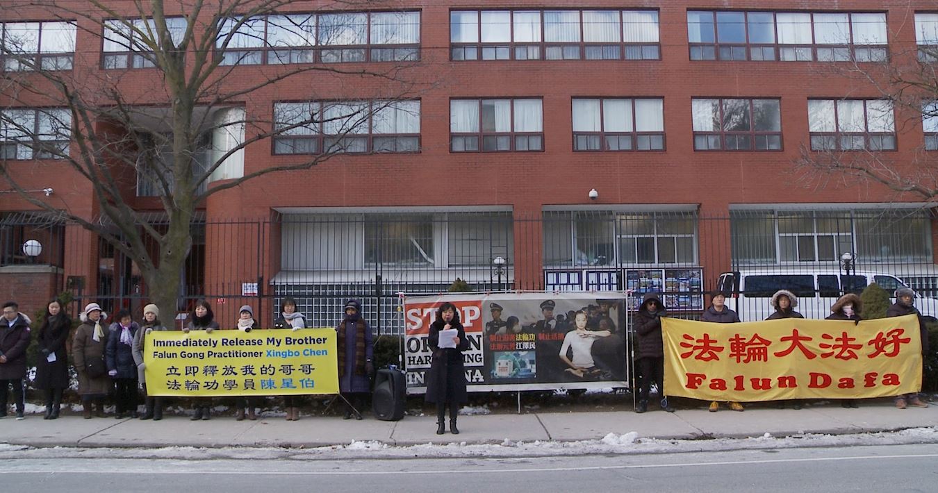 ![]() 图1:二零二零年二月二十日上午,多伦多法轮功学员陈学敏在中领馆前,要求释放遭中共非法关押的哥哥陈星伯。 |