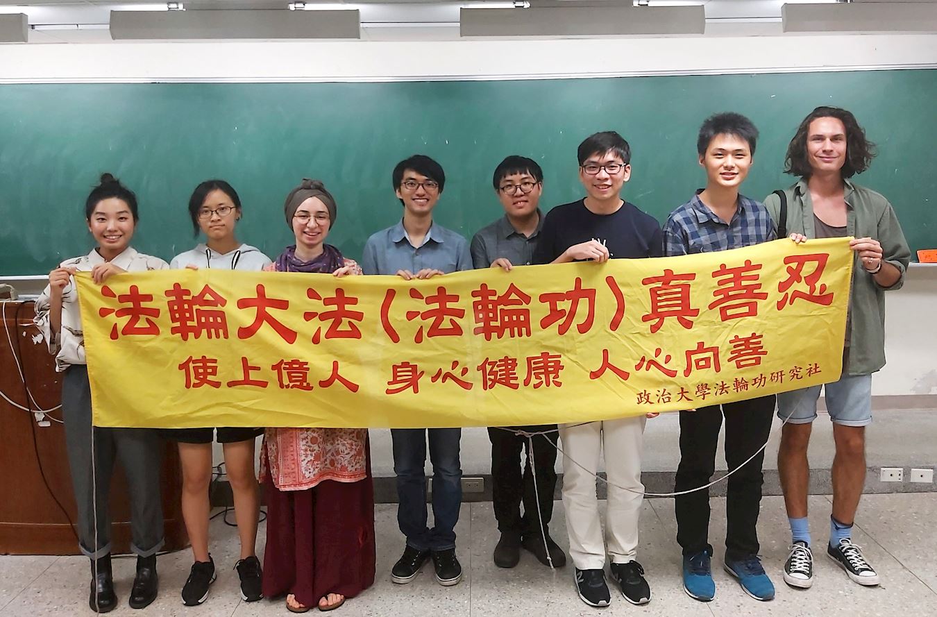 政大法轮大法社每学期期初会举办社团联展,设立展位,让政大师生有机会近距离认识法轮大法的美好。一位来自土耳其就读政大心理系的女孩Sena(中文名:魏熙纯),在社团联展上初步认识真相,明白法轮大法是什么,她对打坐很感兴趣,后来参加社团迎新活动,Sena跟着教功带学炼五套功法。