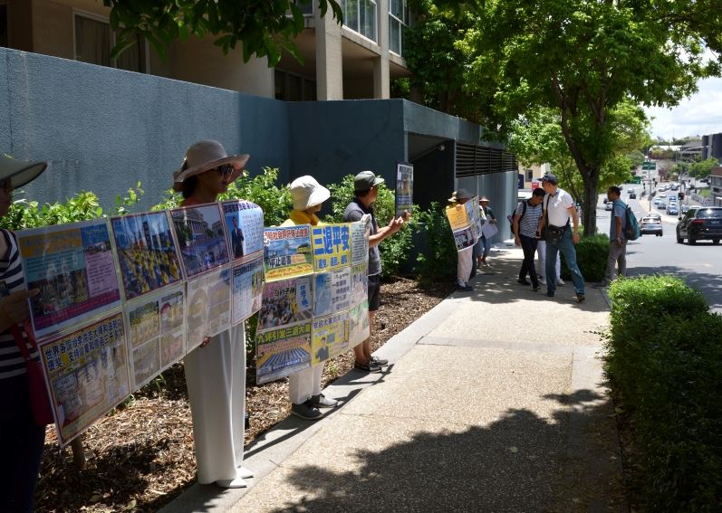 ![]() 图2:在澳洲昆士兰中国城(China Town)旅游大巴下车地点,中国大陆游客关注法轮功学员的真相展板 |