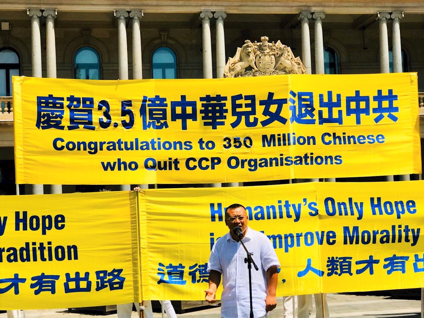王先生是一位移民到澳洲的普通公民,他在中国生活了二十五年,深知中共的邪恶本质。之前他来澳洲旅游时在景点遇到了法轮功学员并退出了中共的团、队组织。他在中文《大.纪.元;》报纸上看到“支持三亿五千万勇士退出中共集会”的消息后,特地来参加集会并要求即兴发言。