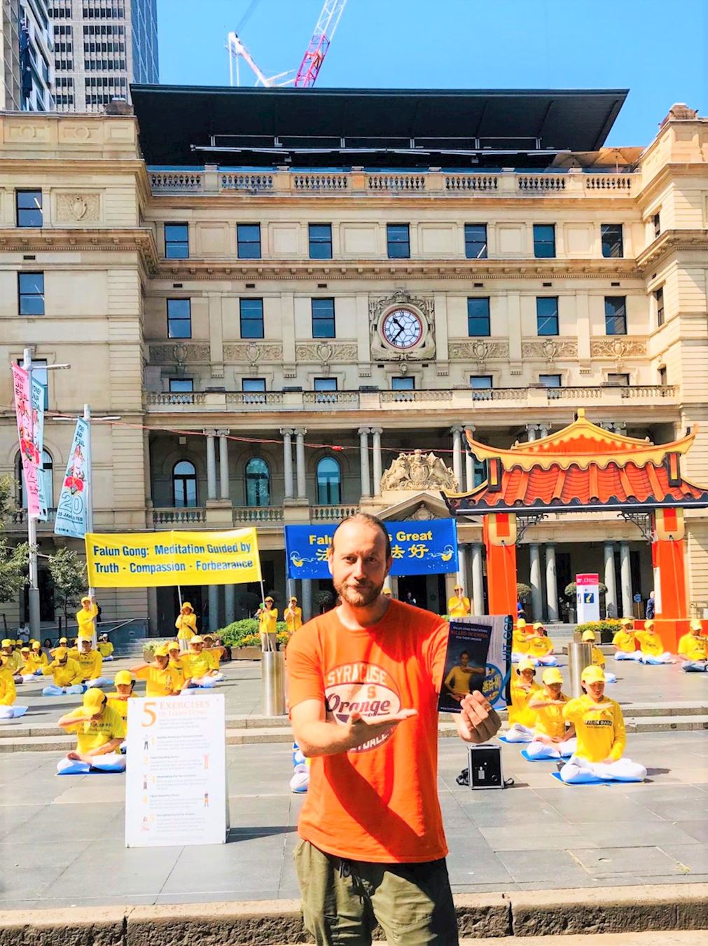 ![]() 图4:布里斯班居民阿德里安·多默(Adrian Dormer)说:“我想向受迫害的中国法轮功学员们传达一个信息:我的心永远与你们同在,坚持做你认为正确的事情。” |