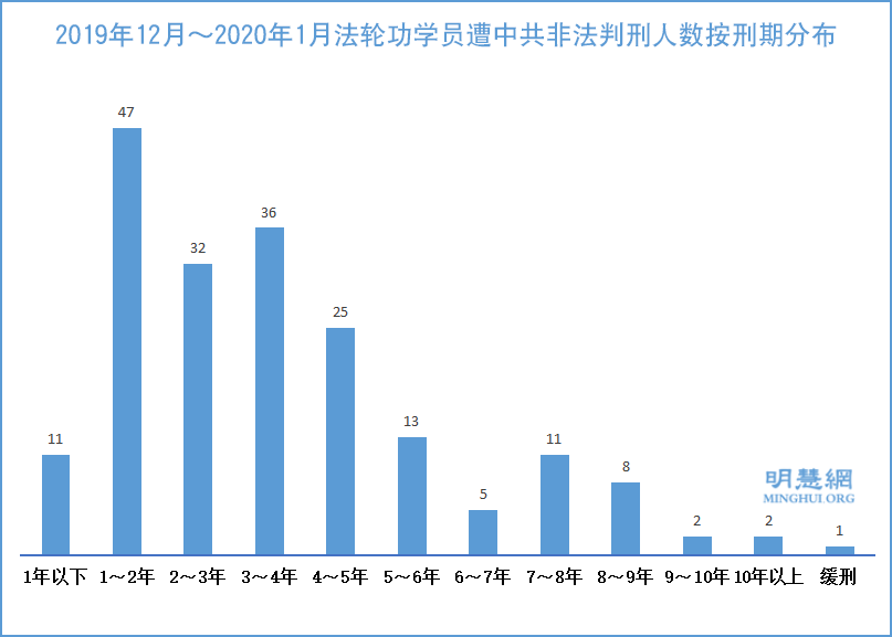 ![]() 图1:2019年12月~2020年1月法轮功学员遭中共非法判刑人数按刑期分布 |
