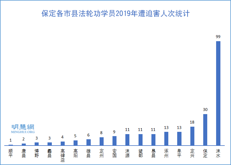 ![]() 图:保定各市县法轮功学员2019年遭迫害人次统计 |