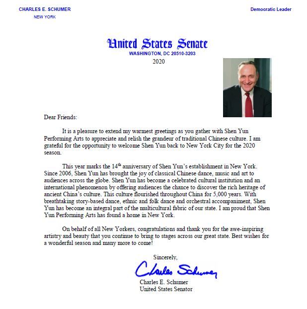 纽约州资深联邦参议员、联邦参议院少数党领袖舒默(Charles E. Schumer)在贺函中表示:“在此最热烈地欢迎神韵艺术团,大家再次欢聚一堂,共同欣赏和品味中国传统文化的博大精深,我很高兴有机会欢迎神韵艺术团重返纽约市,带来2020演出季。”