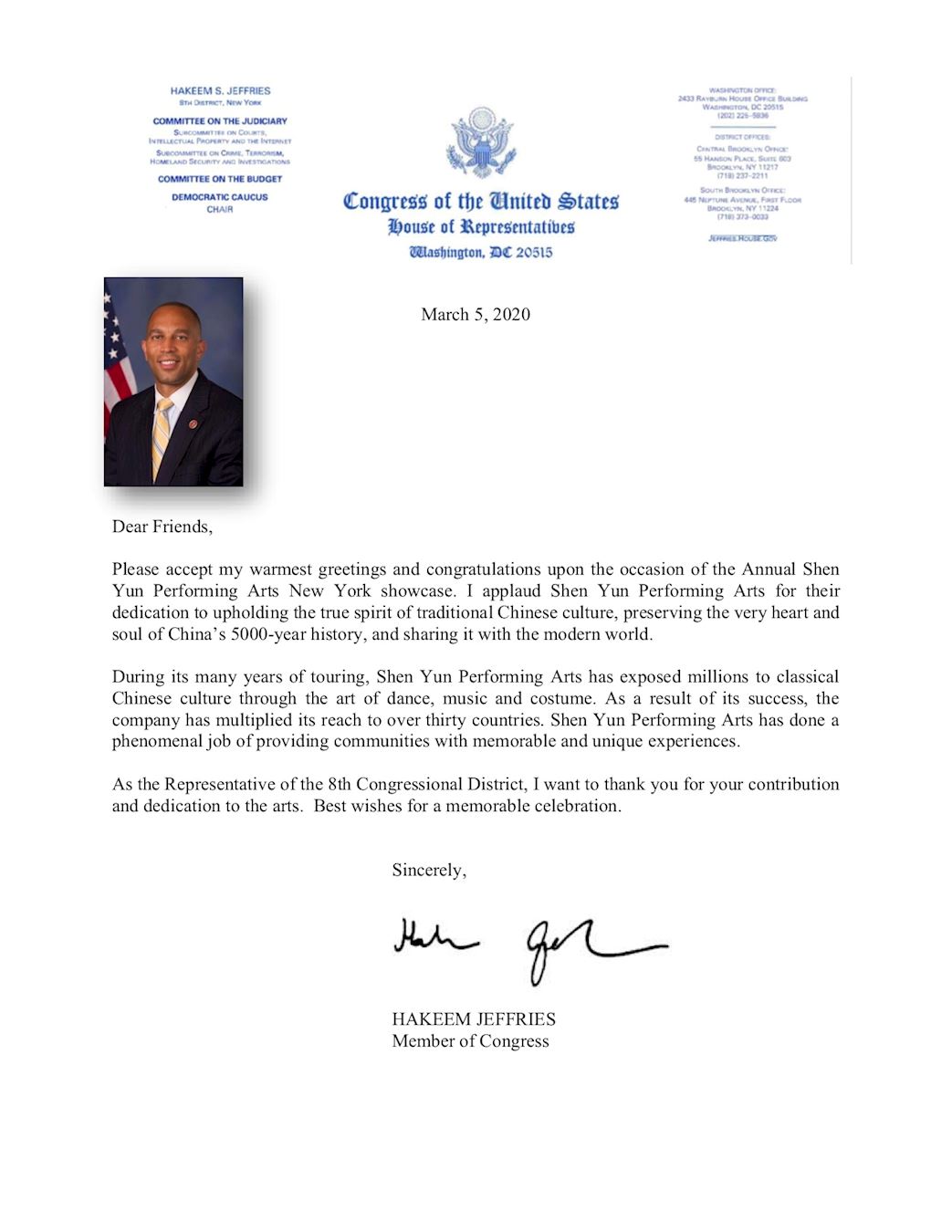 美国国会众议员杰弗里斯(Hakeem S. Jeffries)在贺信中说:“神韵艺术团致力于维护真正的中华传统文化,坚持中国五千年历史的灵魂,并与现代世界分享,我对此赞赏不已。”