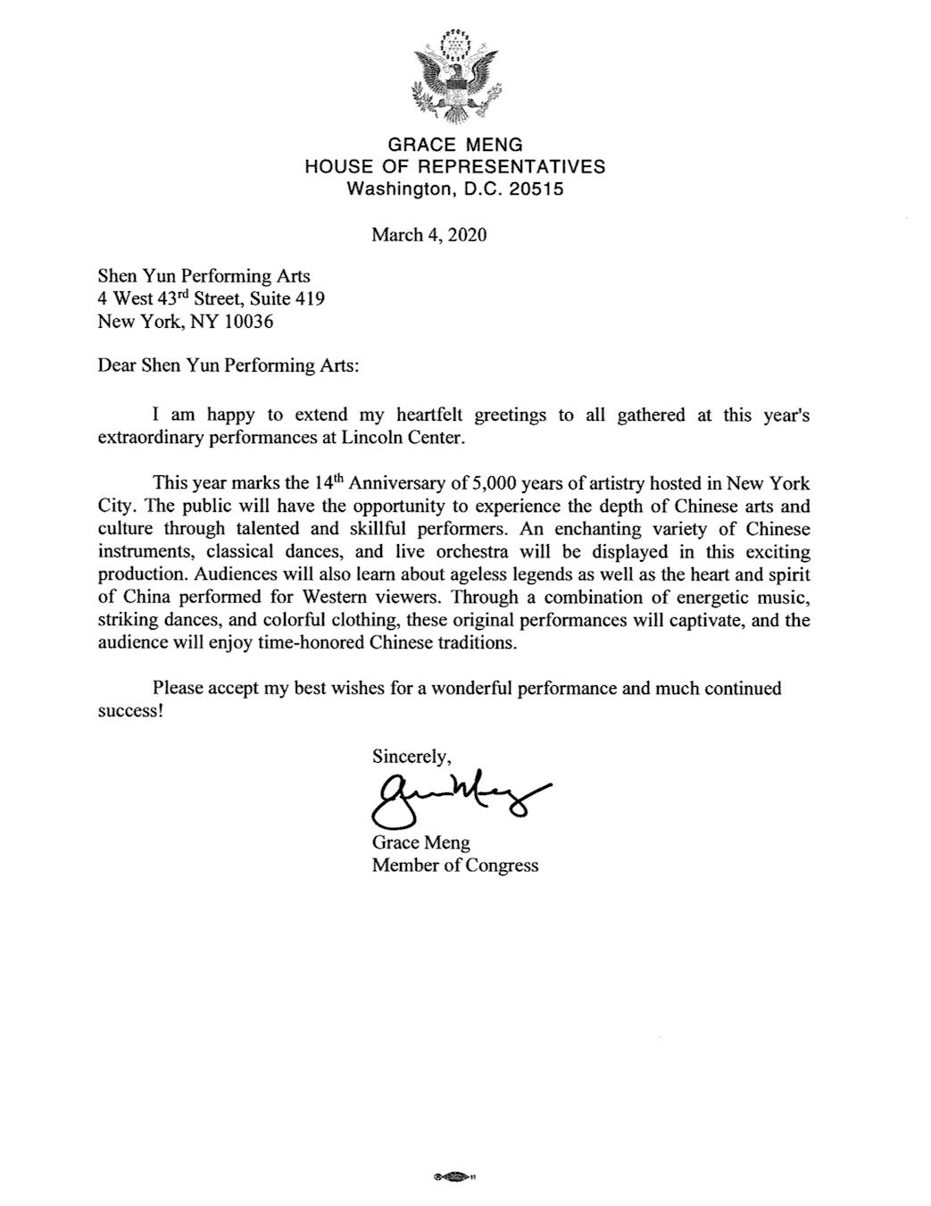 “我衷心向在林肯中心演出的所有人致以最诚挚的问候。”美国国会众议员孟昭文(Grace Meng)在贺信中写道:“今年是(神韵)在纽约市举办5000年艺术创作的十四周年。观众将有机会通过观赏才华横溢的艺术家表演,来体验中华艺术与文化的深邃内涵。”