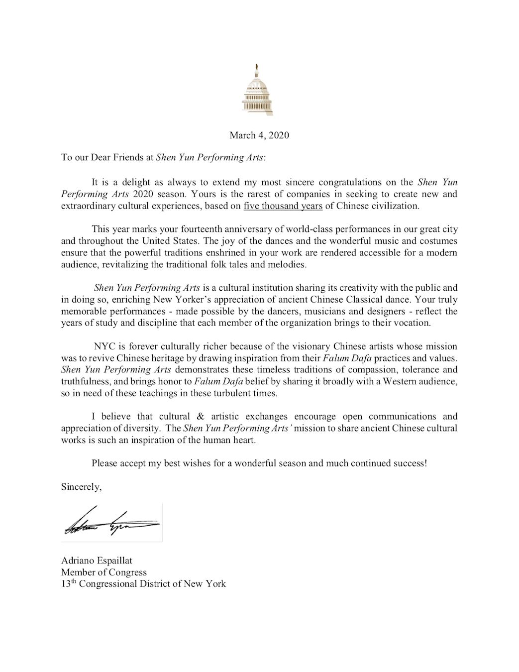 美国联邦国会众议员艾斯柏(Adriano Espaillat)在褒奖状中写道:“在神韵2020表演季之际,我非常高兴地对他们致以最诚挚的祝贺!”