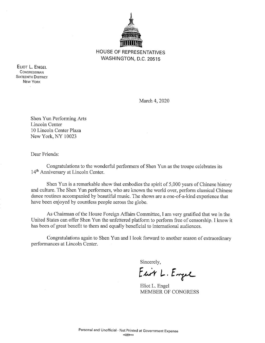 恩格尔说:作为众议院外交事务委员会主席,我非常高兴美国可以为神韵提供一个不受审查的自由平台,我知道这(自由)对神韵和国际社会的观众都是有好处的。再次恭喜神韵,我非常期待新演季!