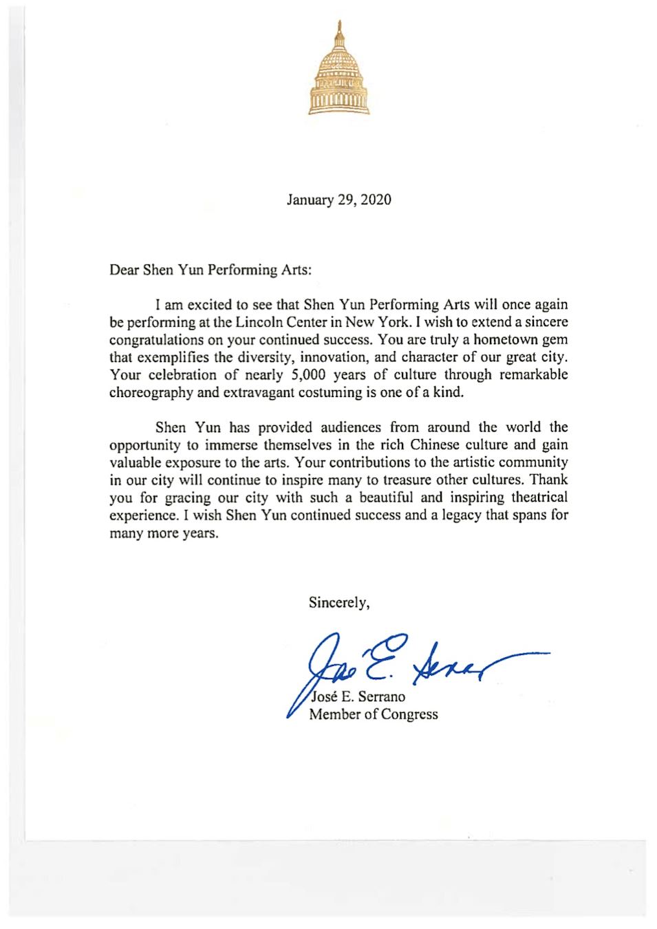 美国国会众议员塞拉诺(Jose E Serrano)说:“我很高兴神韵艺术团将再次莅临纽约林肯中心,衷心祝贺您不断取得成功。”