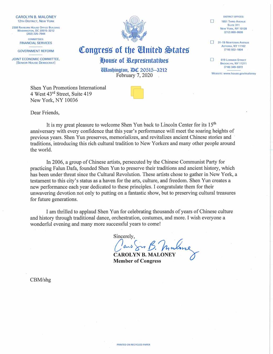 国会众议员马隆妮(Carolyn B. Maloney)在贺信中欢迎神韵重返林肯中心。她说:神韵保存、纪念和恢复中国古代故事与传统,并将这种丰富的文化传统介绍给纽约和世界各地的观众。