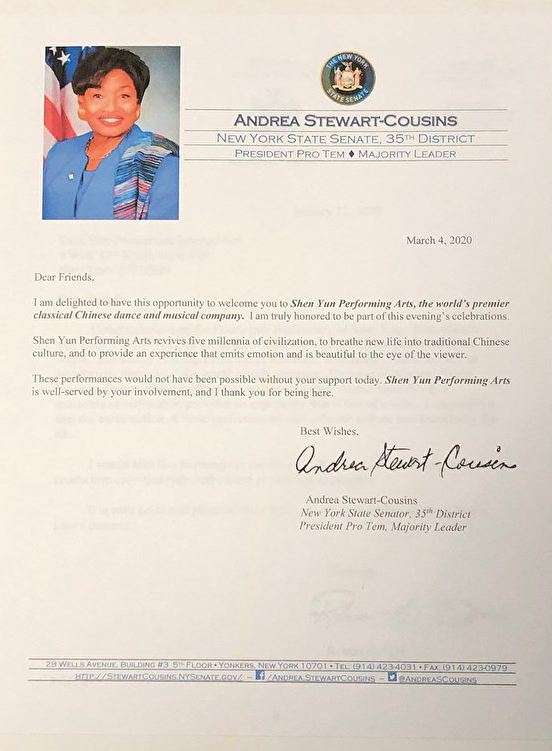 美国纽约州参议院多数党领袖史都华-考辛斯(Andrea Stewart-Cousins)在贺信中说:“我很高兴有此机会欢迎你们来到神韵艺术团——这个世界顶级古典中国舞和音乐团体。我很荣幸参与今晚的庆祝活动。”