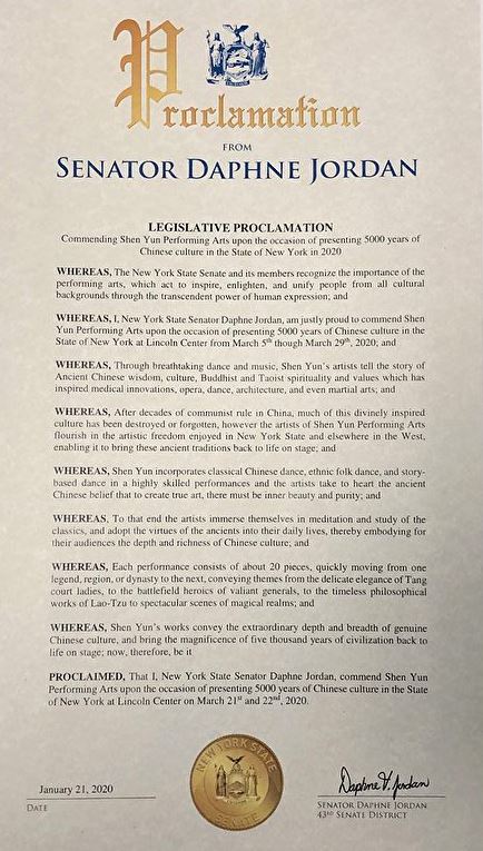 美国纽约州参议员乔丹(Daphne Jordan)在贺信中赞扬神韵艺术团:“通过美得惊人的舞蹈和音乐,神韵艺术家讲述有关古代中国智慧、文化、佛家、道家以及价值观的故事,这一切激励了医学创新,歌剧,舞蹈,建筑,甚至武术(等行业)。”