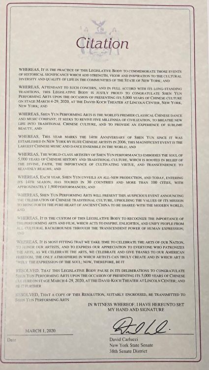 美国纽约州参议员卡鲁奇(David Carlucci)在贺信中表示:“神韵艺术团世界级的艺术体现了中国五千年历史和传统文化的灵魂,后者根植于对神的信仰、注重美德、超越至天国的信念中。在这个吉祥的场合,神韵将宣布庆祝中国传统文化,坚持她展示古代中国的(文化)精髓并将其与现代世界分享的使命。”