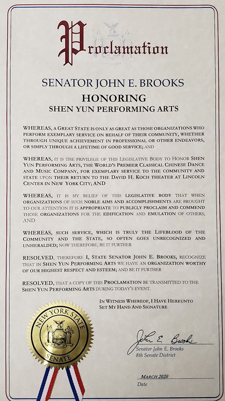 美国纽约州参议员布鲁克斯(John E. Brooks)在贺信中说:“鉴于,这个议会有幸褒奖神韵艺术团——世界顶级古典中国舞和音乐团体,通过重返纽约林肯中心大卫寇克剧场,从而为社会和纽约州提供杰出服务;鉴于,我相信,当拥有如此崇高目标和成就的组织得到我们关注的时候,我们理应公开称赞那些教化他人的组织;作为纽约州参议员,我表彰神韵艺术团是一个值得我们最高尊敬的组织。”