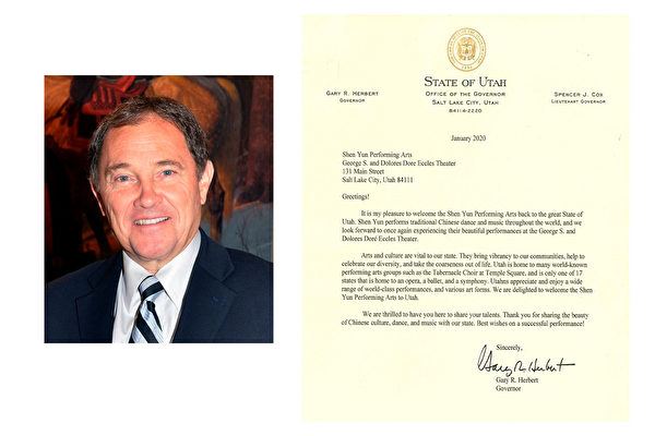 赫伯特在贺信中说:“我愉快地欢迎你们再次来盐湖城。”他并说:“艺术和文化对犹他州至关重要。他们为我们的社区带来活力,帮助庆祝我们的多元性,并帮助我们摆脱生活中的烦恼。犹他州是许多举世闻名的演出艺术团体的所在地。犹他州民众欣赏各种各样的世界级演出。我们很高兴欢迎神韵艺术团来到犹他州。”