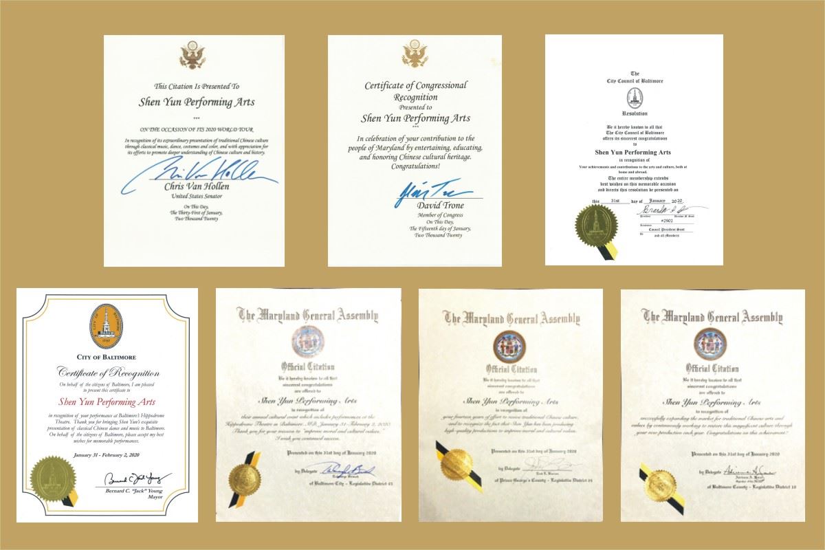 二零二零年一月三十一日至二月二日,神韵艺术团在巴尔的摩竞技场剧院(The Hippodrome Theatre)上演了四场演出,马里兰州的二十一位三级政要和巴尔的摩市议会通过决议案褒奖和祝贺神韵,其中包括美国联邦参议员范浩伦(Chris Van Hollen)、国会众议员特朗(David Trone),马里兰州众议院议长琼斯(Adrienne Jones),州众议员布兰奇(Talmadge Branch)、巴伦(Erek Barron),巴尔的摩市长伯纳德·扬(Bernard C. "Jack" Young)等。