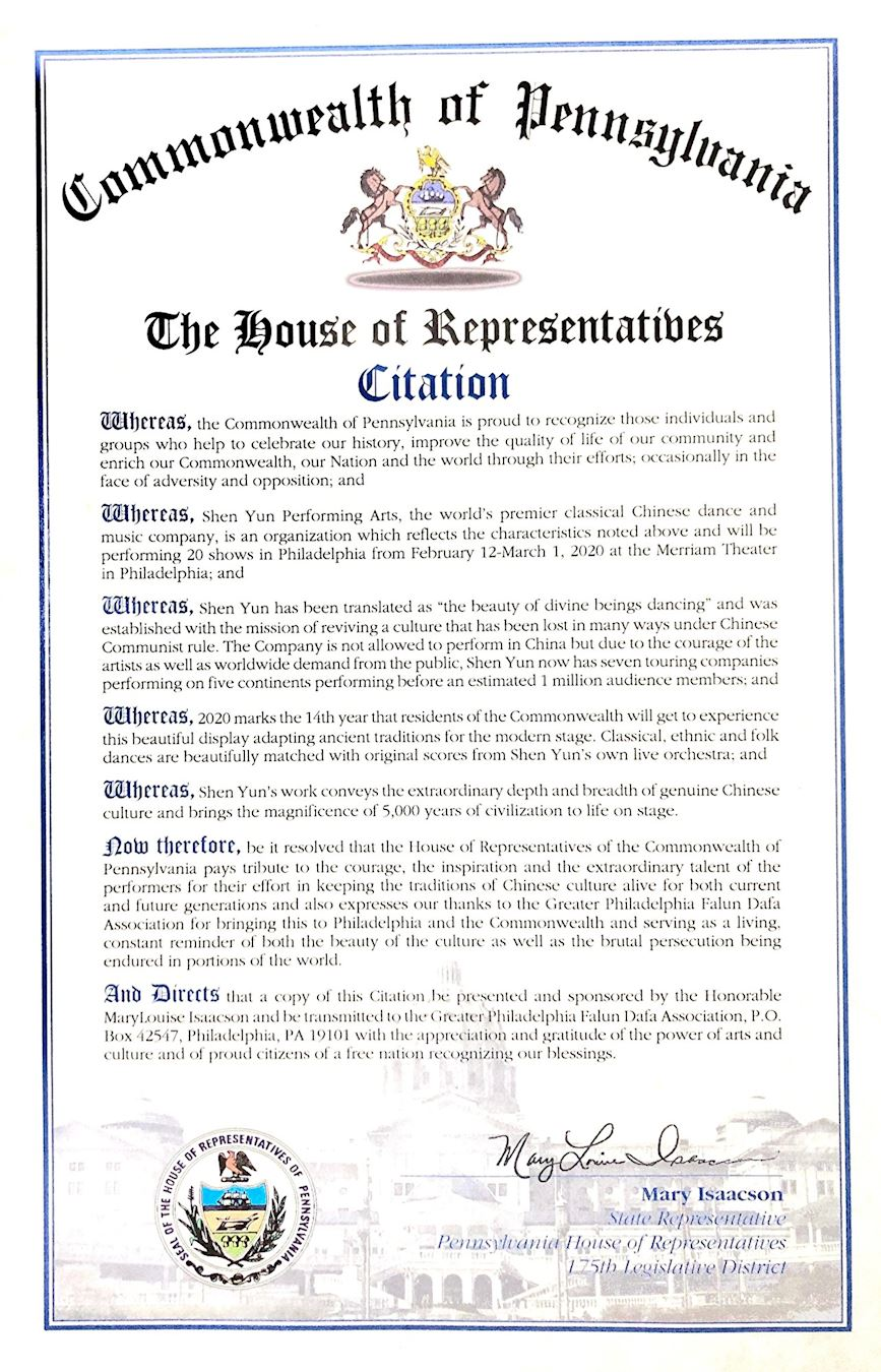 今年,神韵艺术团再次莅临美国最老、最具历史意义的城市之一、别称“友爱之城”的费城,从二零二零年二月十二日至三月一日,玛丽安剧院(Merriam Theater)上演二十场演出。美国宾州众议员艾萨克森(Mary Louise Isaacson)特地派代表到演出剧院给演出主办方颁发宾州众议院对神韵的褒奖,表彰神韵“为现代及未来世世代代复兴中华传统文化所做的努力”。