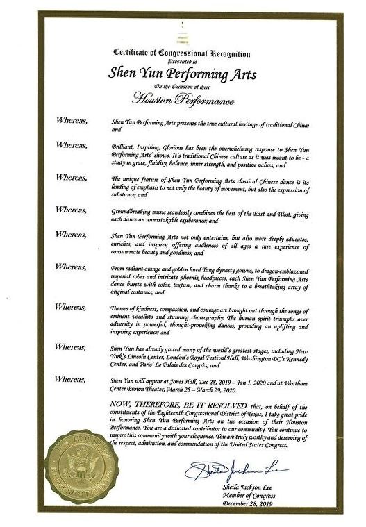 美国联邦国会众议员希拉·杰克逊·李(Sheila Jackson Lee)向休斯顿神韵晚会主办方发来褒奖信。她在信中说:“我代表德克萨斯州第十八届国会选区的选民,在休斯顿演出之际向神韵艺术团致敬,并为之深感自豪。你们是我们社区的一个贡献者;请你们继续用动人心弦的(演出)激励这个社区;你们确实值得美国国会给予尊重、钦佩和赞扬。”