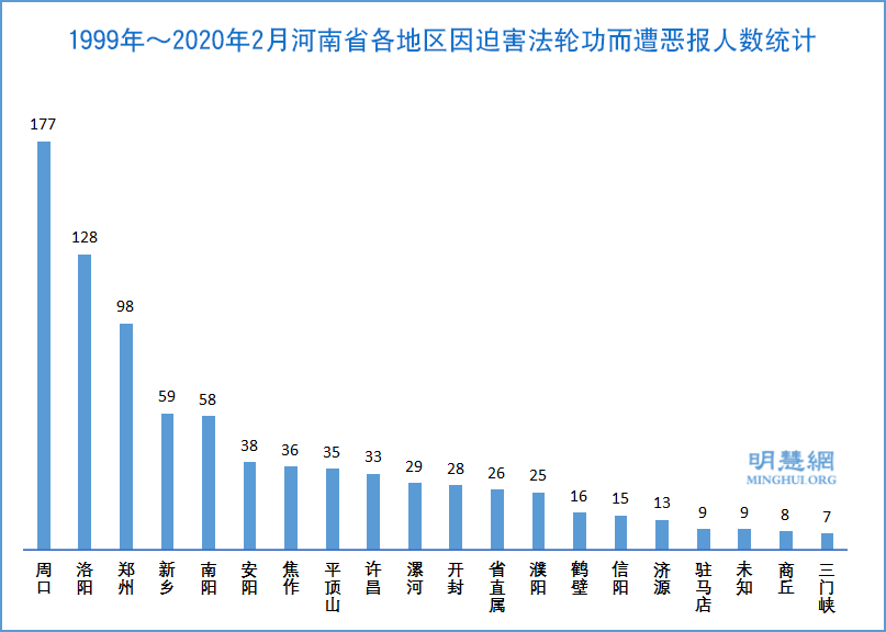 ![]() 图1:1999年~2020年2月河南省各地区因迫害法轮功而遭恶报人数统计 |