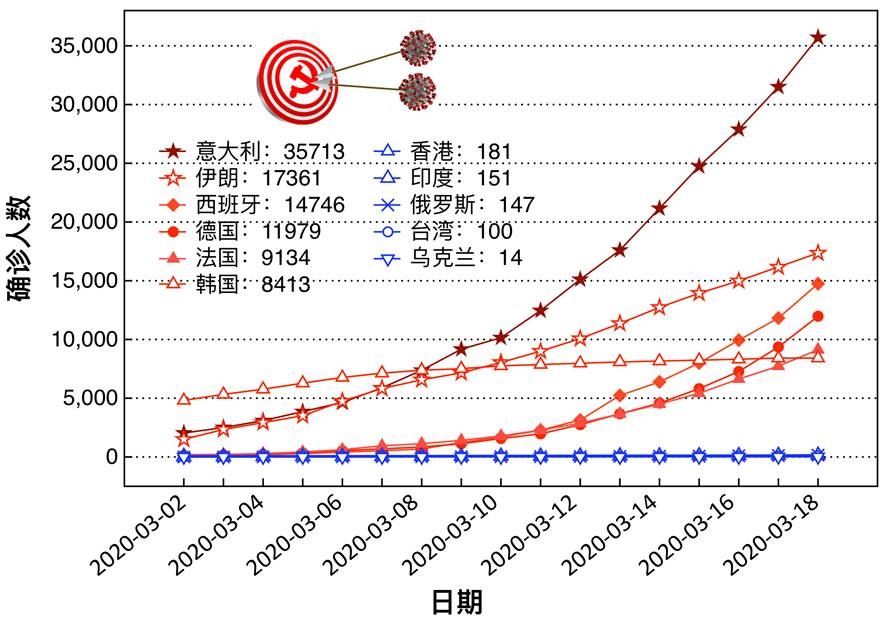 截至3月18日,除中国外,武汉肺炎累计确诊病例人数最多的几个国家分别是意大利、伊朗、西班牙、德国、法国和韩国。从资料看,这几个国家都是跟中共走的非常近的国家。