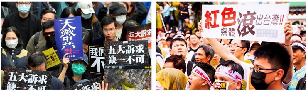 ![]() 图2:邻近大陆的香港和台湾,都因为拒绝了中共而成功抵御了武汉肺炎。右图:台湾大选前夕,民众驱逐中共操控的红色媒体。 |