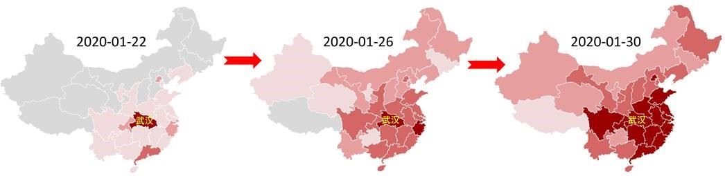 ![]() 图3: 武汉肺炎从武汉爆发后,在短时间内迅速蔓延全中国。 |