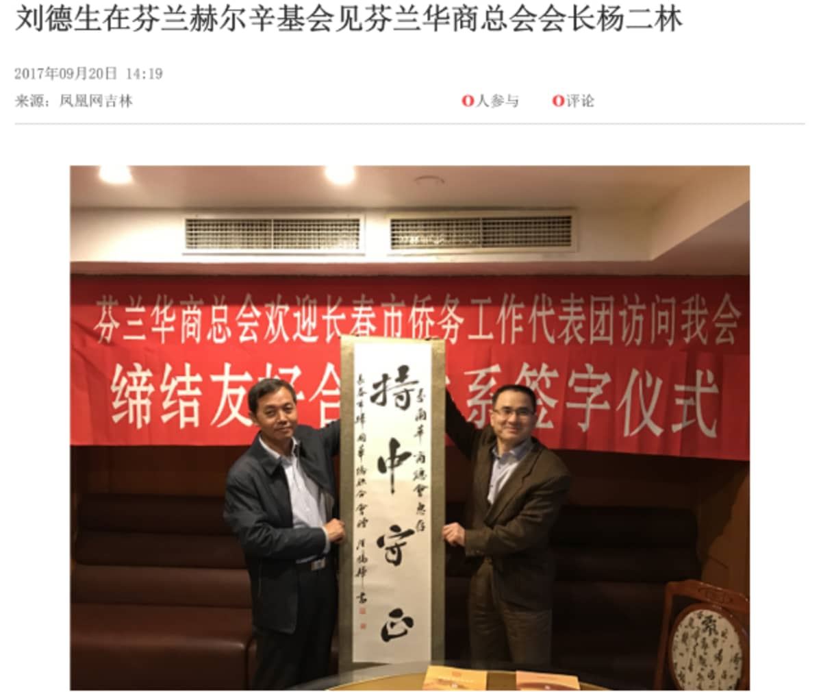 ![]() 图11:2017年9月18日,长春市委常委、统战部长刘德生在芬兰赫尔辛基会见芬兰华商总会会长杨二林。(图片来自YLE) |