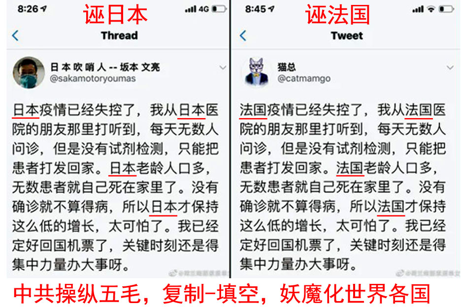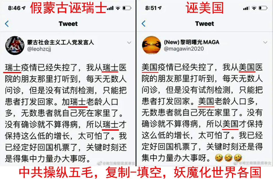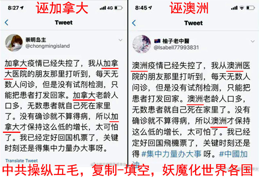 ![]() 图1:2020年3月,海外自媒体搜索到大量雷同的谣言,被揭露为中共五毛的统一行动,祸乱各国(推特截图1) |