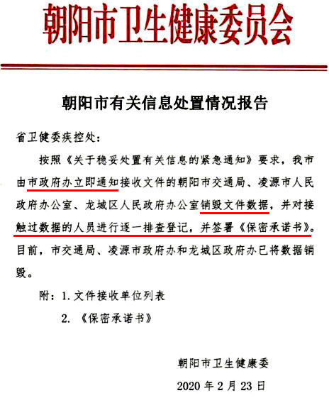 ![]() 图2:中共政府销毁疫情数据的文件截图(辽宁省朝阳市) |